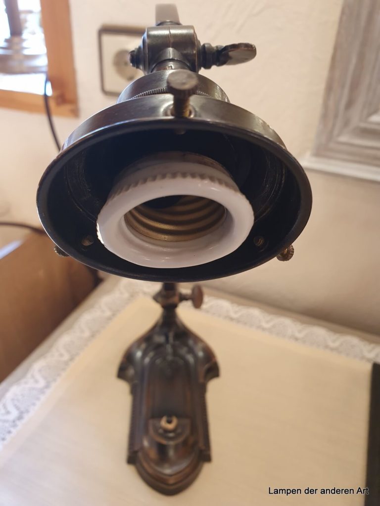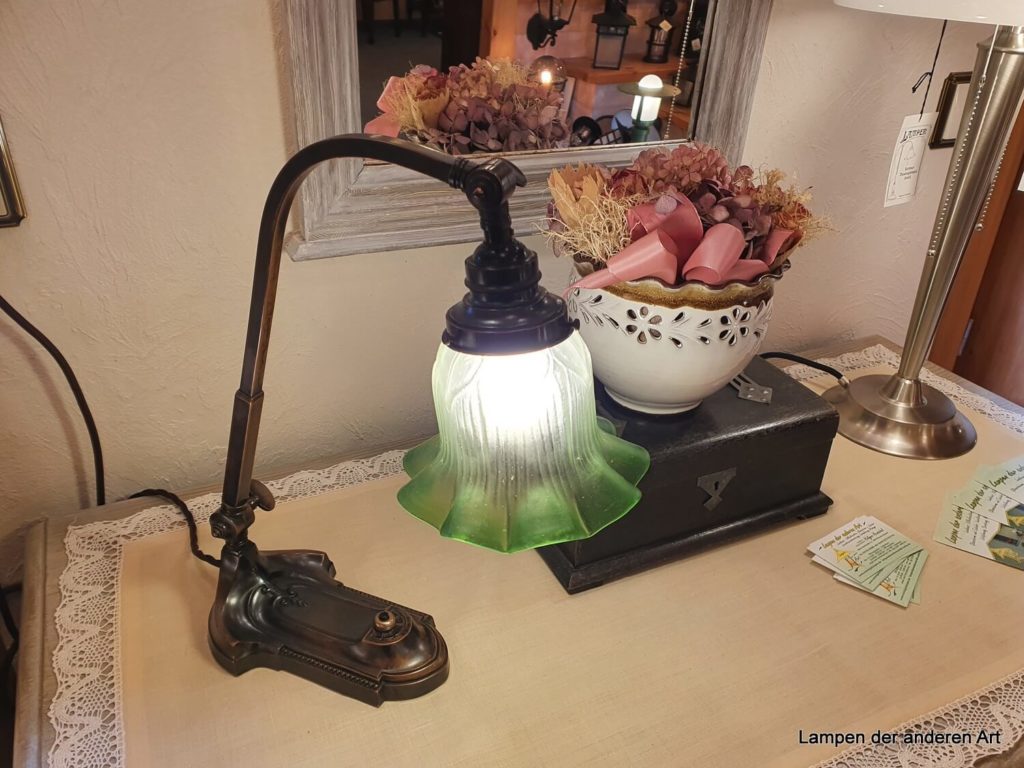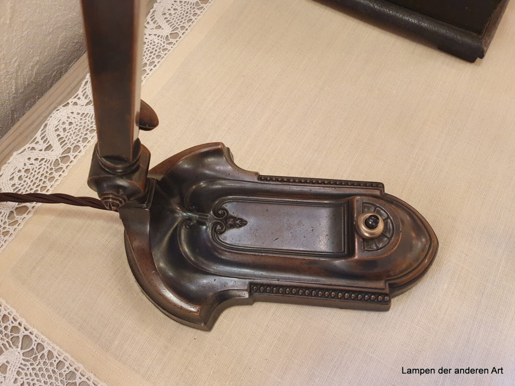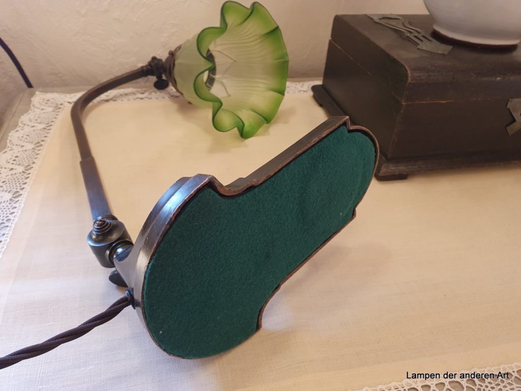 schöne originale Jugendstil Klavier- oder auch Schreibtischleuchte, Leuchtenarm über zwei Drehgelenke verstellbar, Fuss mit Perlfries am Rand und mittig mit typischen Jugendstilornamenten verziert., erneuerter Druckschalter im Leuchtenfuss, geflochtenes braunes Textilkabel, Messingfassung E27 original, Höhe Leuchte max. 40cm, max.Länge inkl. Fuss und Schirm 42cm, Fuss 19x12cm. Bestückt ist die Leuchte mit einem grün-satinierten Jugendstilschirm, welcher typisch für diese Zeit mit 3 Schrauben an der Leuchte befestigt wird. Dadurch kann der Schirm auch ausgetauscht werden. Er muss nur einen Griffrand von 6cm haben. Falls Sie sich in unserem Angebot einen anderen Schirm ausgesucht haben, kontaktieren Sie uns bitte – wir tauschen den Schirm gerne für Sie aus.