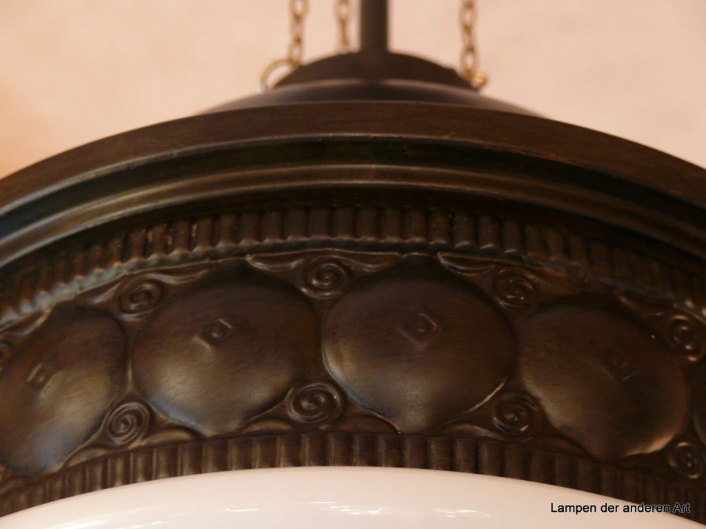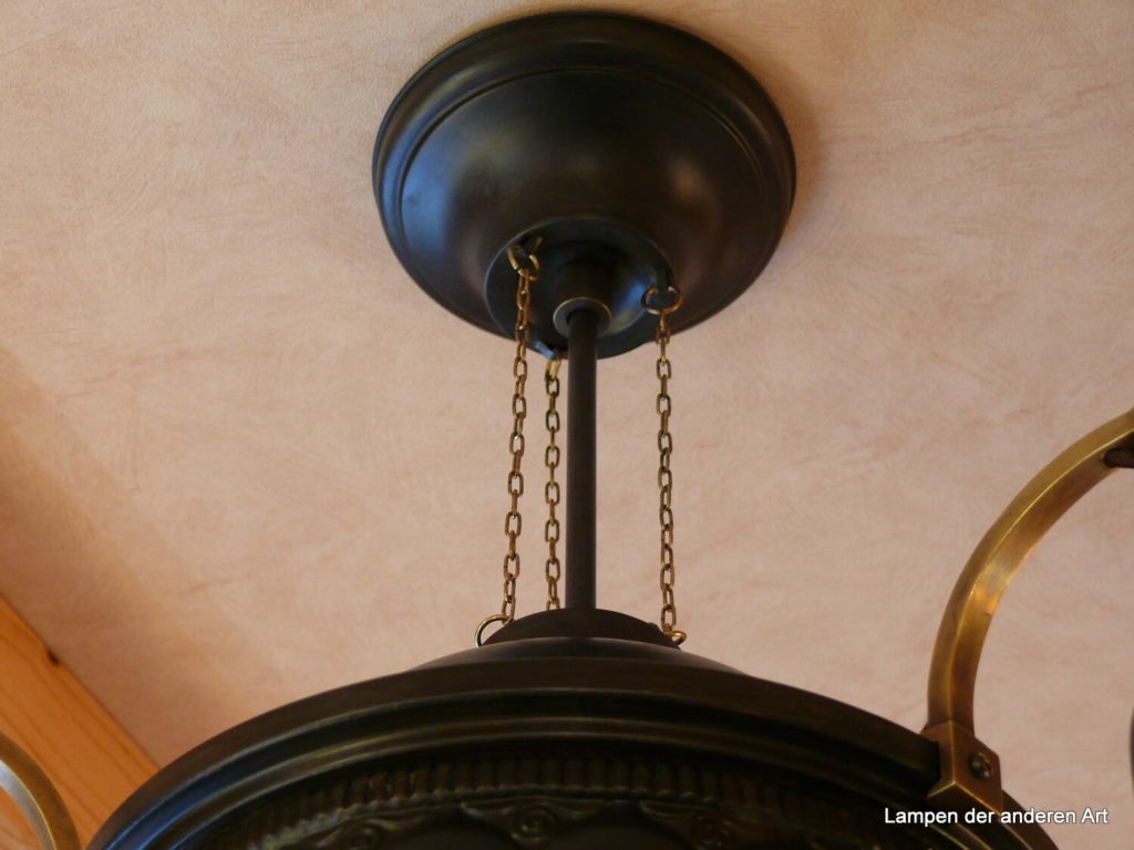 Die Leuchte wurde komplett aufgearbeitet. Corpus und Baldachin sind aus brüniertem Eisenblech. Zierketten und Leuchterarme aus patiniertem Messing. Die Leuchte wurde mit dunkelbraunem Textilkabel neu verkabelt. Die Metallfassungen 4xE27/60W sind ebenfalls neu. Die Leuchtmittel sind enthalten (3x 8W/LED-Globelampen, 1x AGL). Das Kuppelglas in opalweiß ist mundgeblasen und wurde nach originalen Vorlagen nachgefertigt.