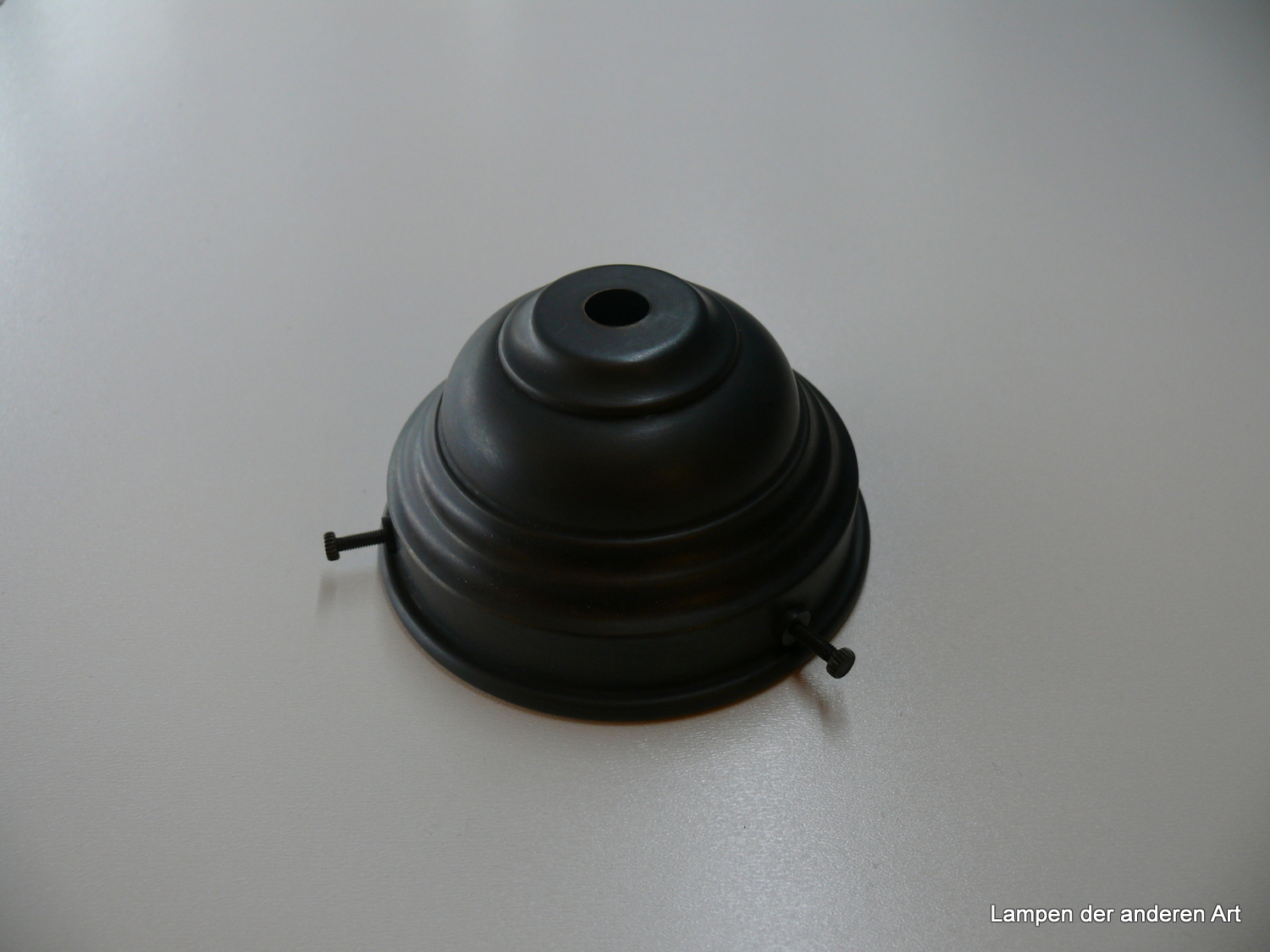 Glashalter aus Messing mit 3 Schrauben zum befestigen des Glasschirmes mit Griffrand 8cm, Bohrung oben 10mm Durchmesser außen 9,4cm, innen 8,2cm, Höhe 5,2cm, Schrauben M3 x 15mm Oberfläche antik-dunkel