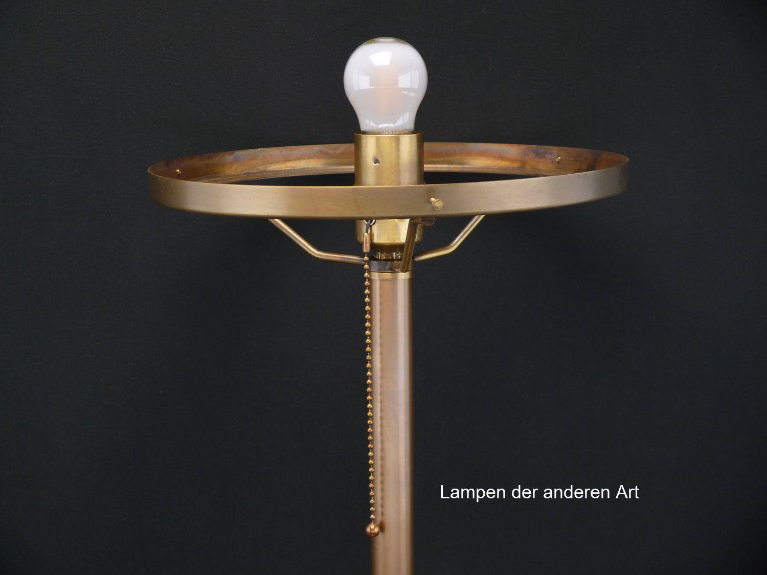 Das Leuchtengestell besteht aus hell patiniertem Messing. Kleine Blessuren am Fuß bestätigen, dass es sich hier um einen alten gebrauchten Gegenstand handelt.