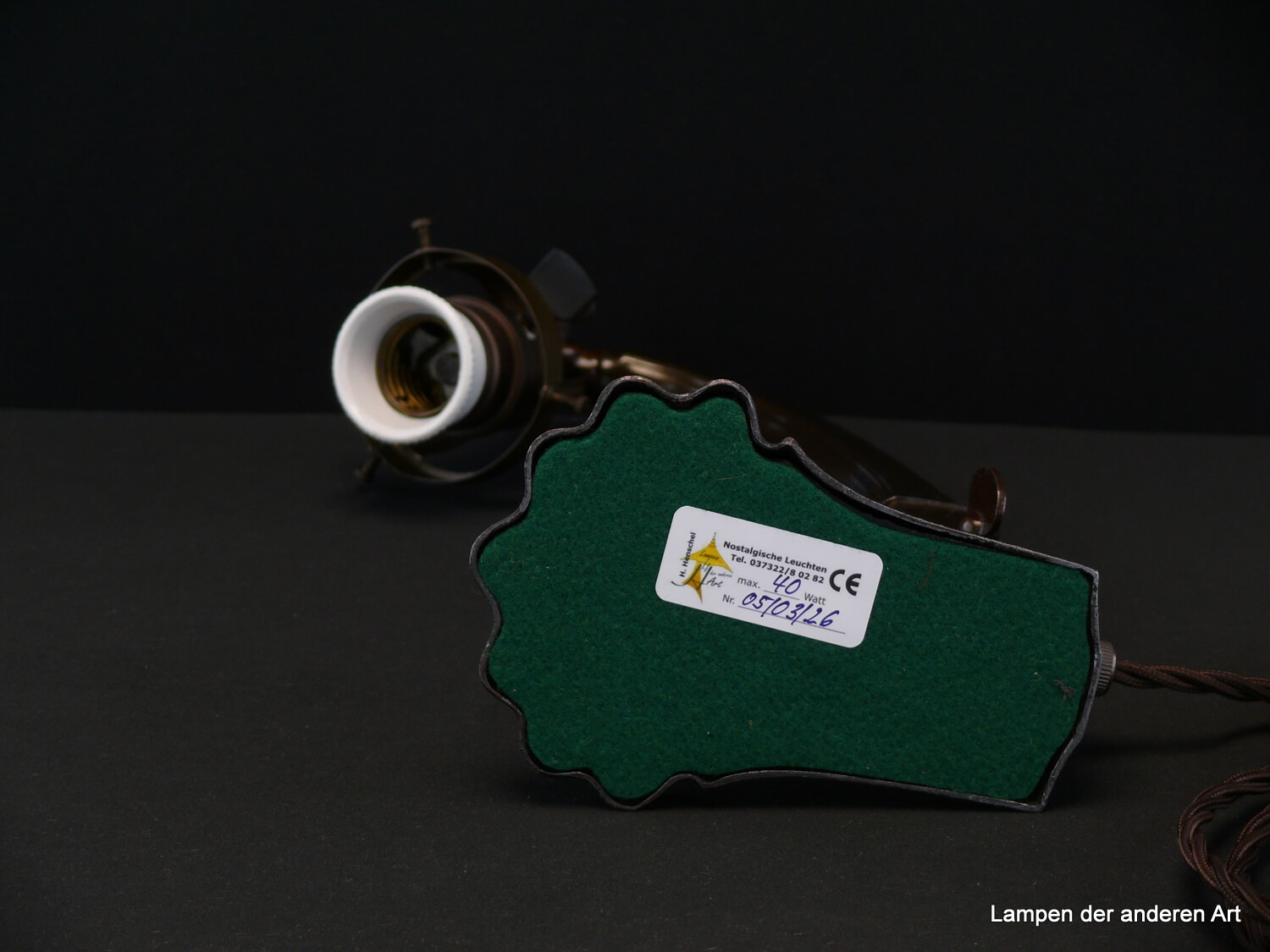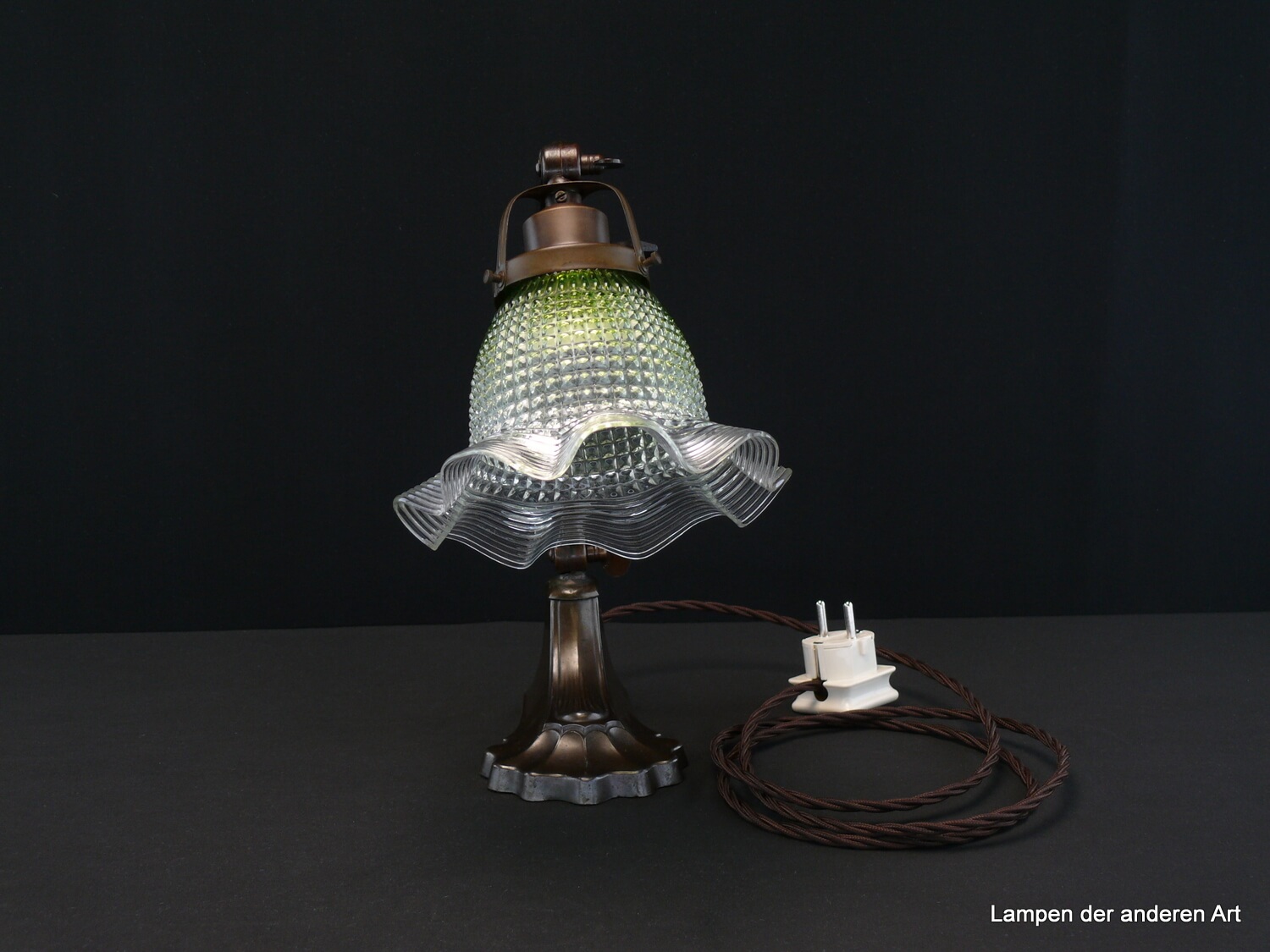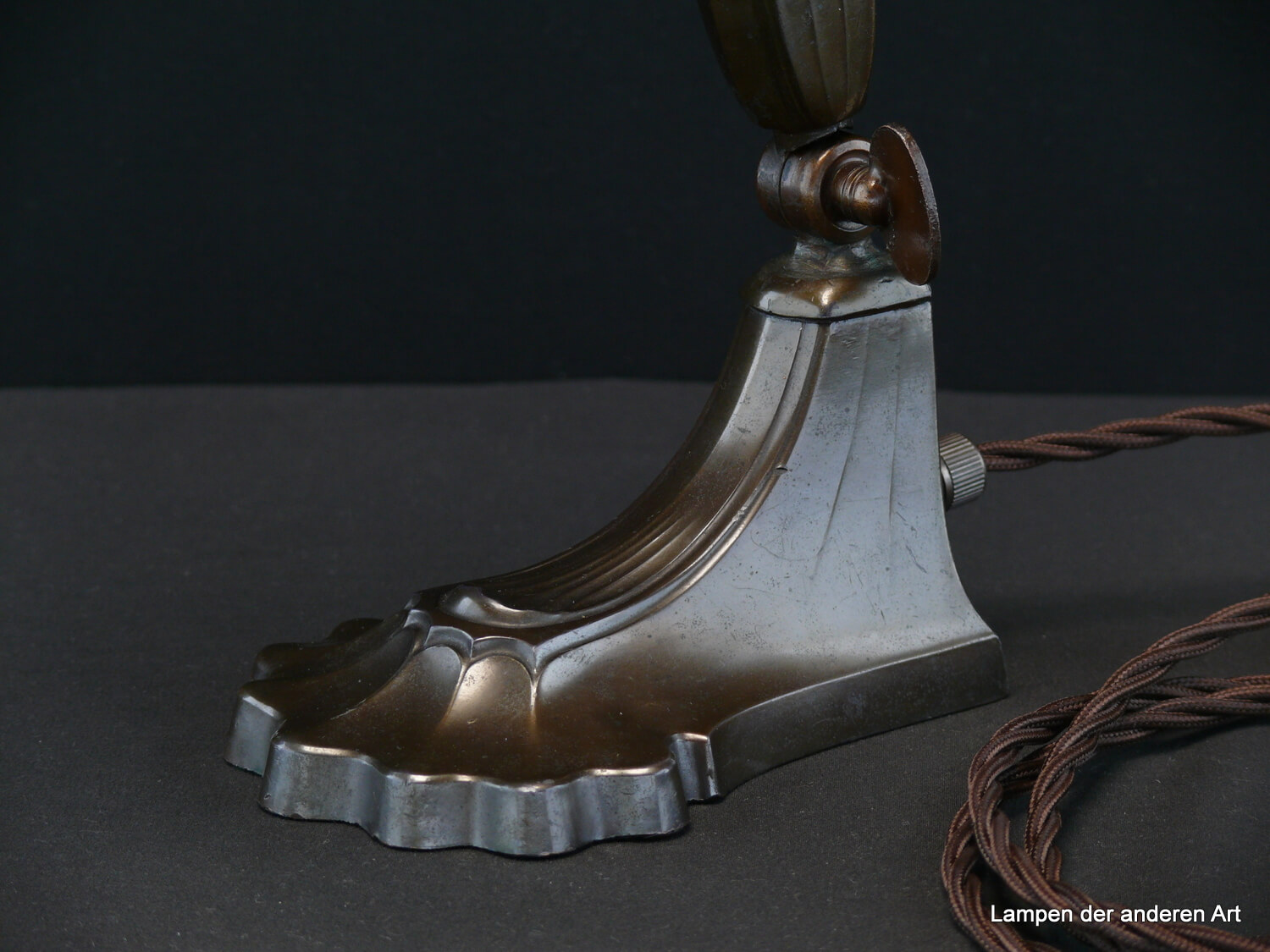 schöne originale Jugendstil Nachttisch- oder auch Schreibtischleuchte, Leuchtenarm über ein Drehgelenk verstellbar, Fuss mit einfachen typischen Jugendstilornamenten verziert., originale Drehschalterfassung E27, neues geflochtenes braunes Textilkabel, Höhe Leuchte max. 30cm, max.Länge inkl. Fuss und Schirm 25cm, Fuss 14x9 cm. Bestückt ist die Leuchte mit einem Jugendstilschirm mit grünem Farbverlauf, welcher typisch für diese Zeit mit 3 Schrauben an der Leuchte befestigt wird. Dadurch kann der Schirm auch ausgetauscht werden. Er muss nur einen Griffrand von 6cm haben. Falls Sie sich in unserem Angebot einen anderen Schirm ausgesucht haben, kontaktieren Sie uns bitte - wir tauschen den Schirm gerne für Sie aus.