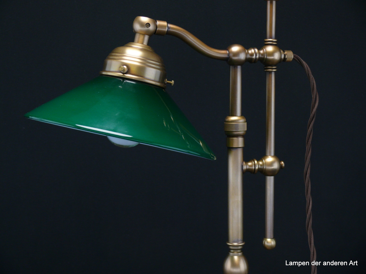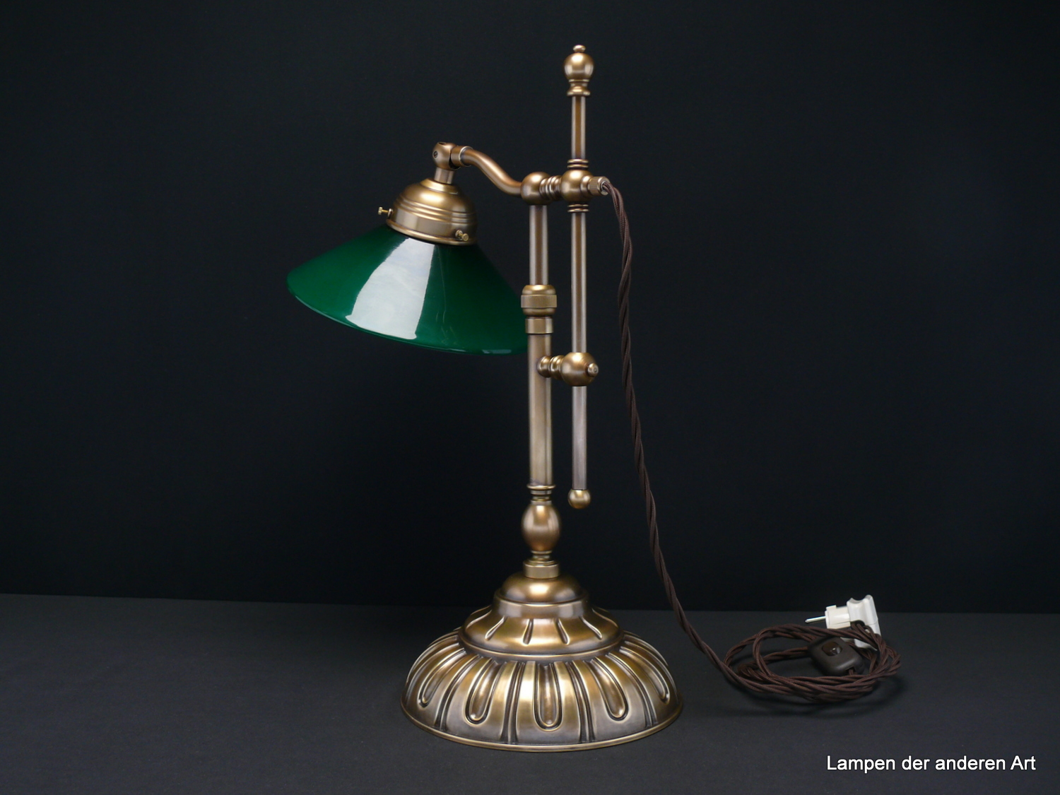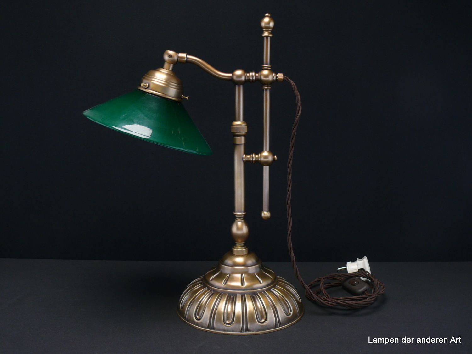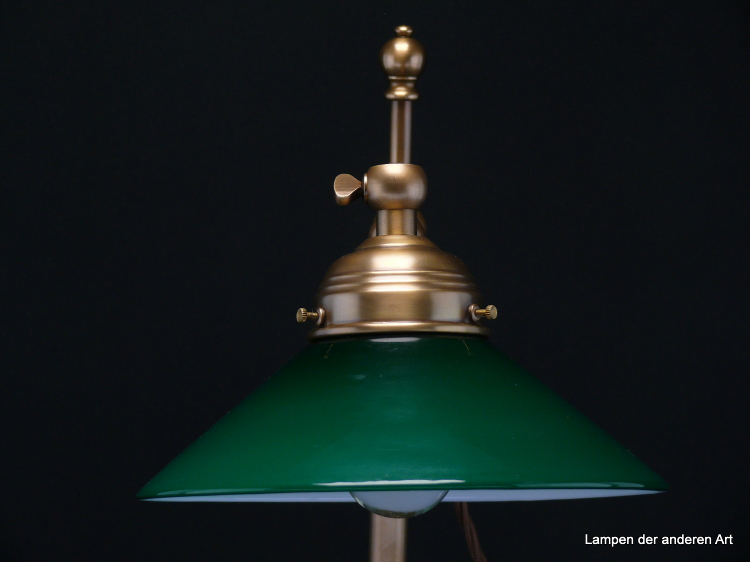 Tischleuchte aus Messing mit großem Messingfuss. Höhe verstellbar von 41-52cm.Durchmesser Fuss 20cm. Komplett restauriert.Mit flaschengrünem Schirm. Die Leuchte kann auch mit einem anderen Schirm, welcher einen Griffrand von 6cm hat, bestückt werden. Die Anschlussleitung der Tischlampe besteht aus einem ca. 1,50m langen geflochtenen dunkelbraunen textilummantelten Kabel. In der Anschlußleitung befindet sich auch der Schalter um die Leuchte ein- oder auszuschalten. 1x E27/40W H=41-52cm, Durchmesser Schirm 20cm.