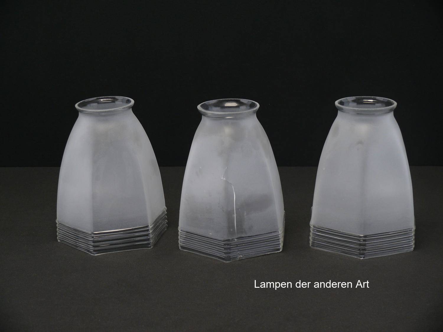 zwei Art Deco Lampenschirme gebraucht im Set, Glas satiniert grau, angeschrägte Flächen, antik, Klarglasrand gerillt, Nostalgie Ersatzschirm D: ca.11cm, H: ca.13cm, Glashalter Griffrand 6cm - gemessen 5,7cm, ein Schirm mit einem Riss aber intakt ohne Fehlstellen montierbar als Zugabe