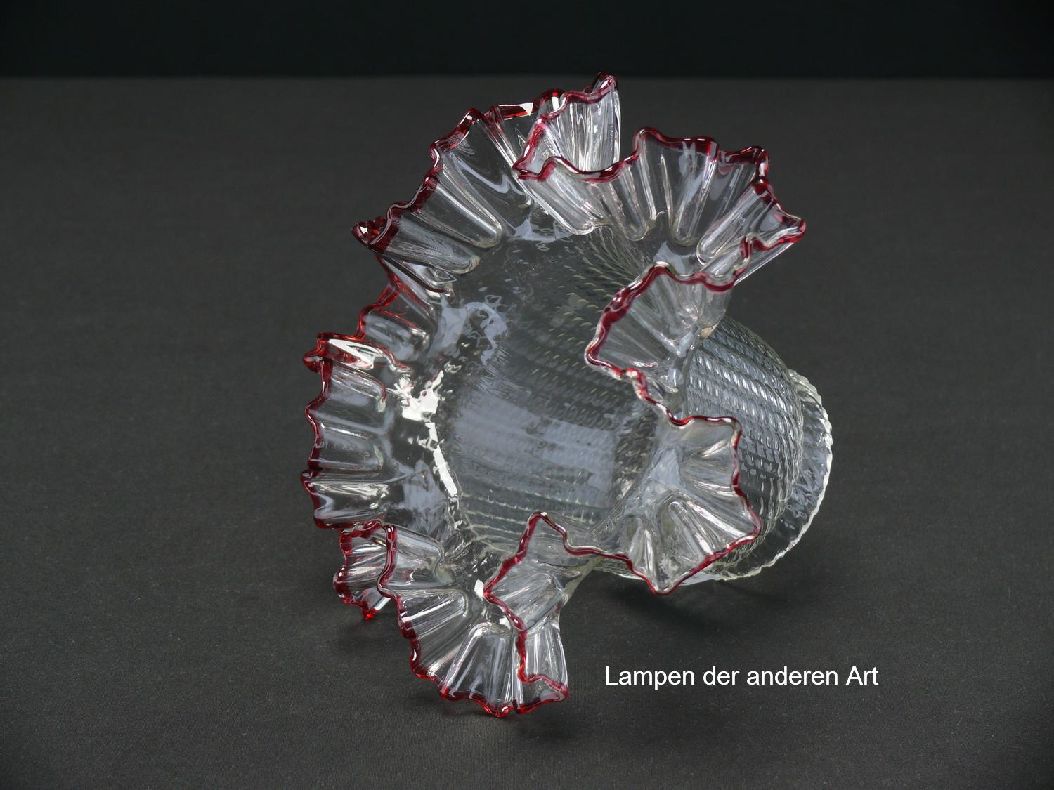 2-er Set Jugendstil Lampenschirm gebraucht, gerader Glaszylinder Klarglas, Oberfläche reliefiert, aufgezogener stark gekniffener Rand, extra aufgelegter Glasfaden in rot als Abschluss, Nostalgie Ersatzglas, D: ca.15cm, H: ca.10cm, Glashalter Griffrand Ø 6cm - gemessen 5,7cm
