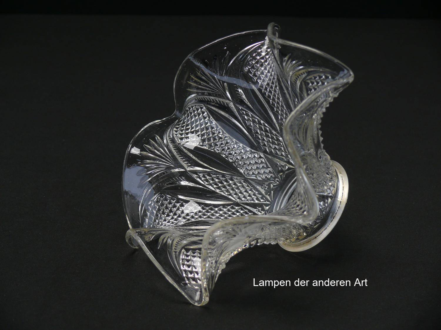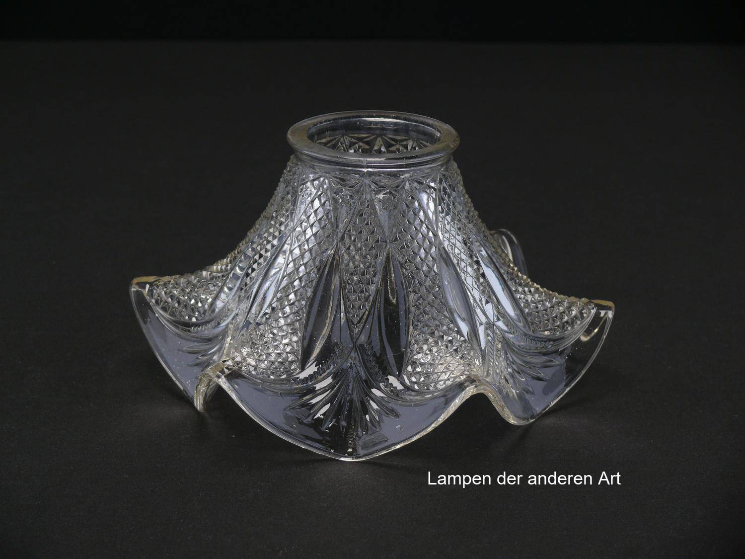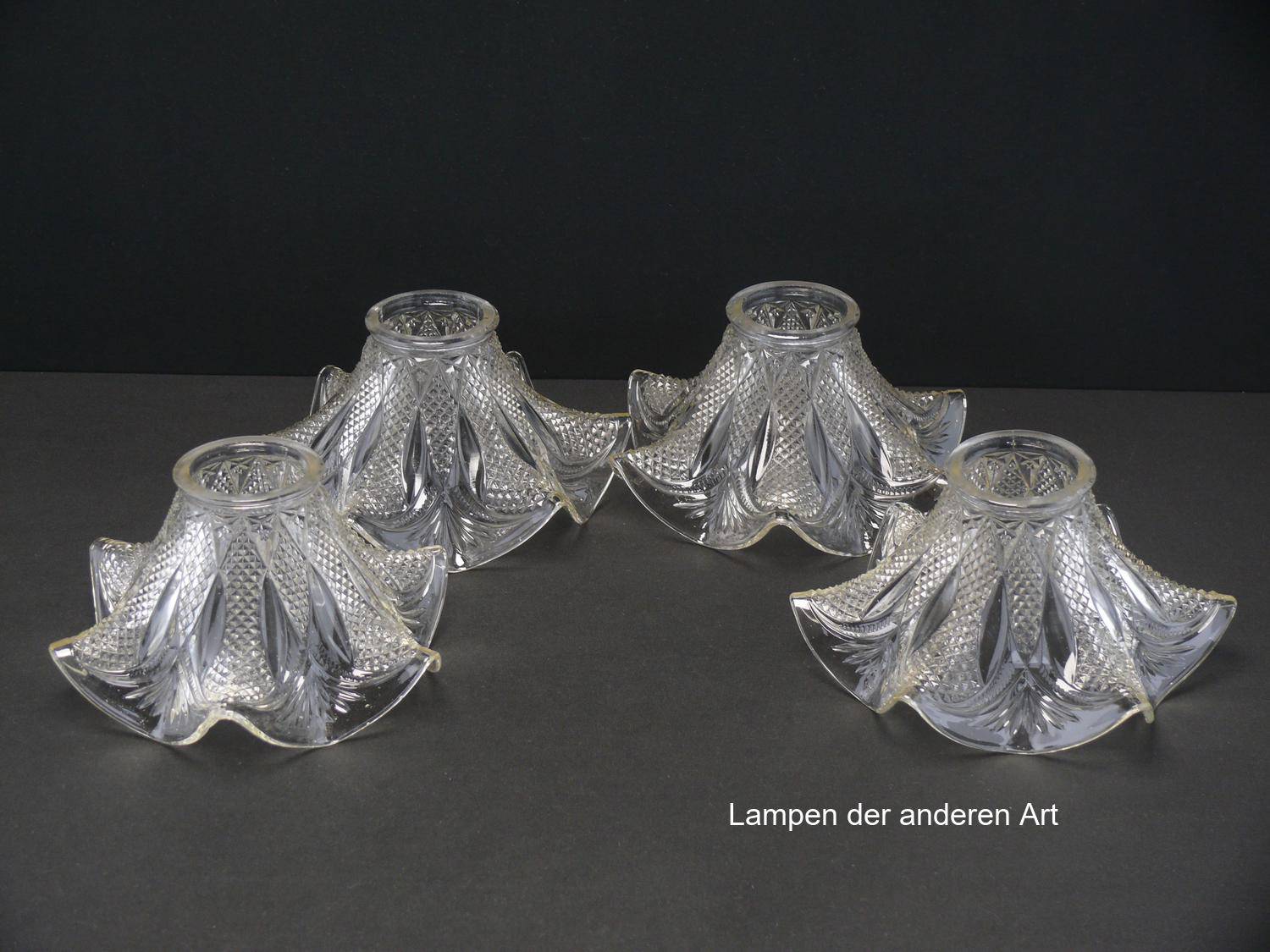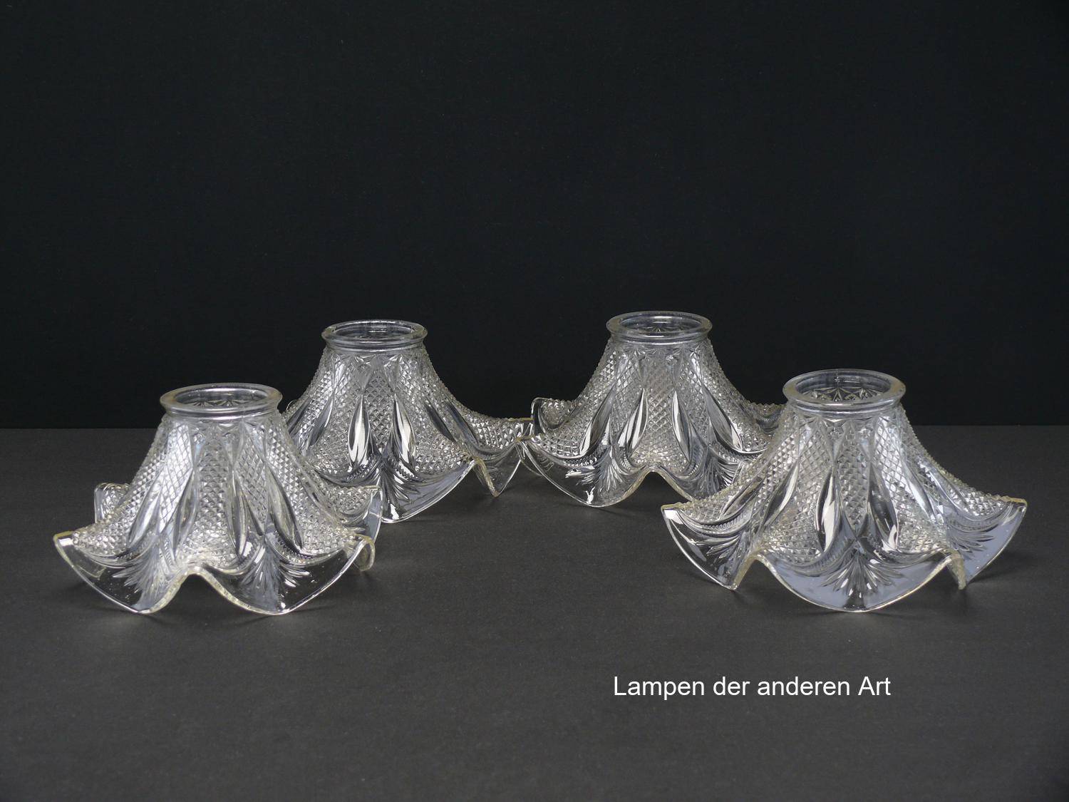 4-er Set Jugendstil Lampenschirm gebraucht, antik, Pressglas klar, ausgestellte reliefierte Wandung, geschwungener Abschlussrand, Nostalgie Ersatzglas, D: ca.17cm, H: ca.9cm, Glashalter Griffrand 6cm - gemessen 5,8cm