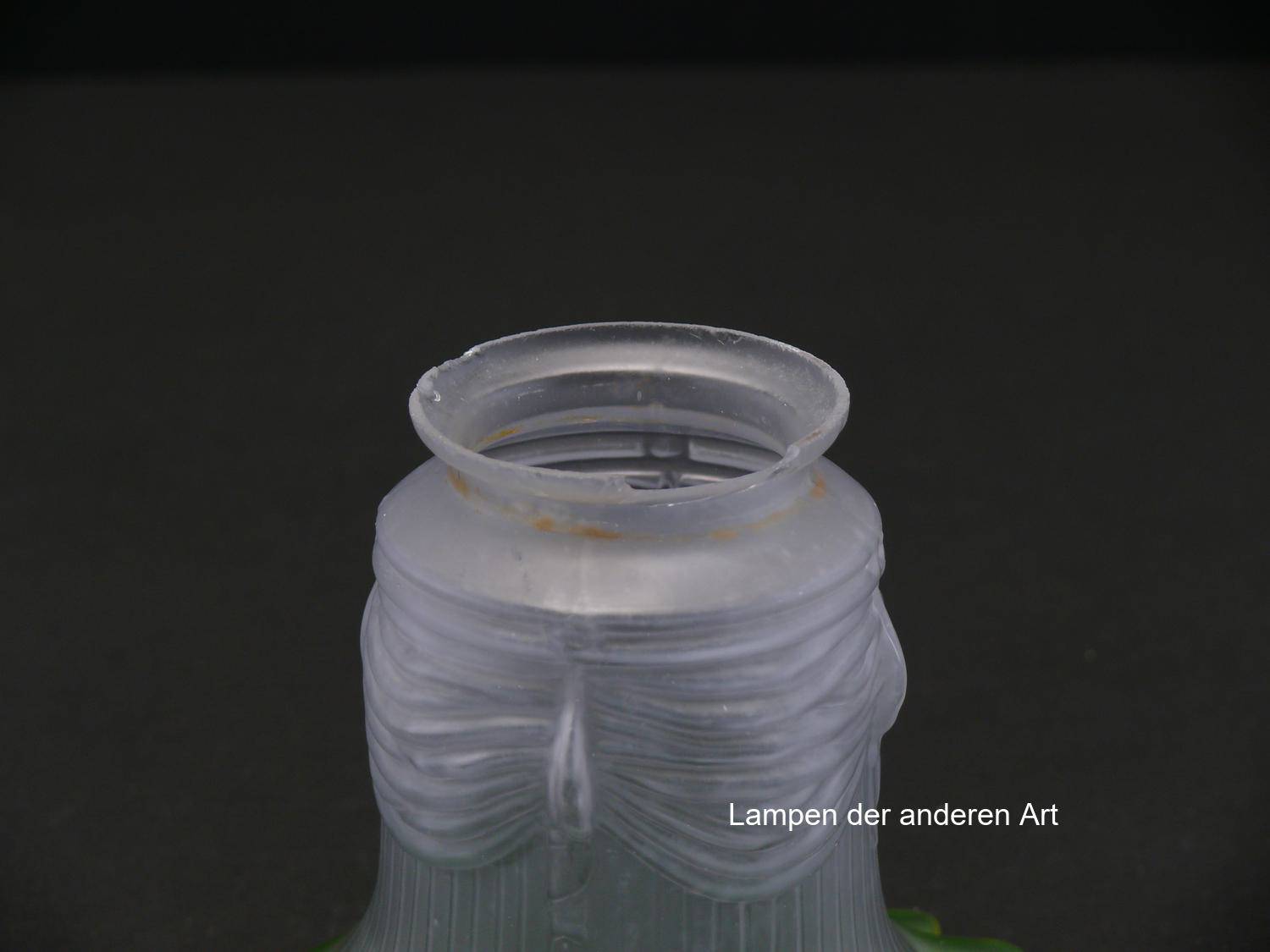 Jugendstil Lampenschirm gebraucht, grau satiniertes Glas, schlanker Körper, gekniffener Rand grüner Abschluss, Nostalgie Ersatzglas D: ca.14cm, H: ca.11,5cm, Glashalter Griffrand Ø 6cm - gemessen 5,7cm,