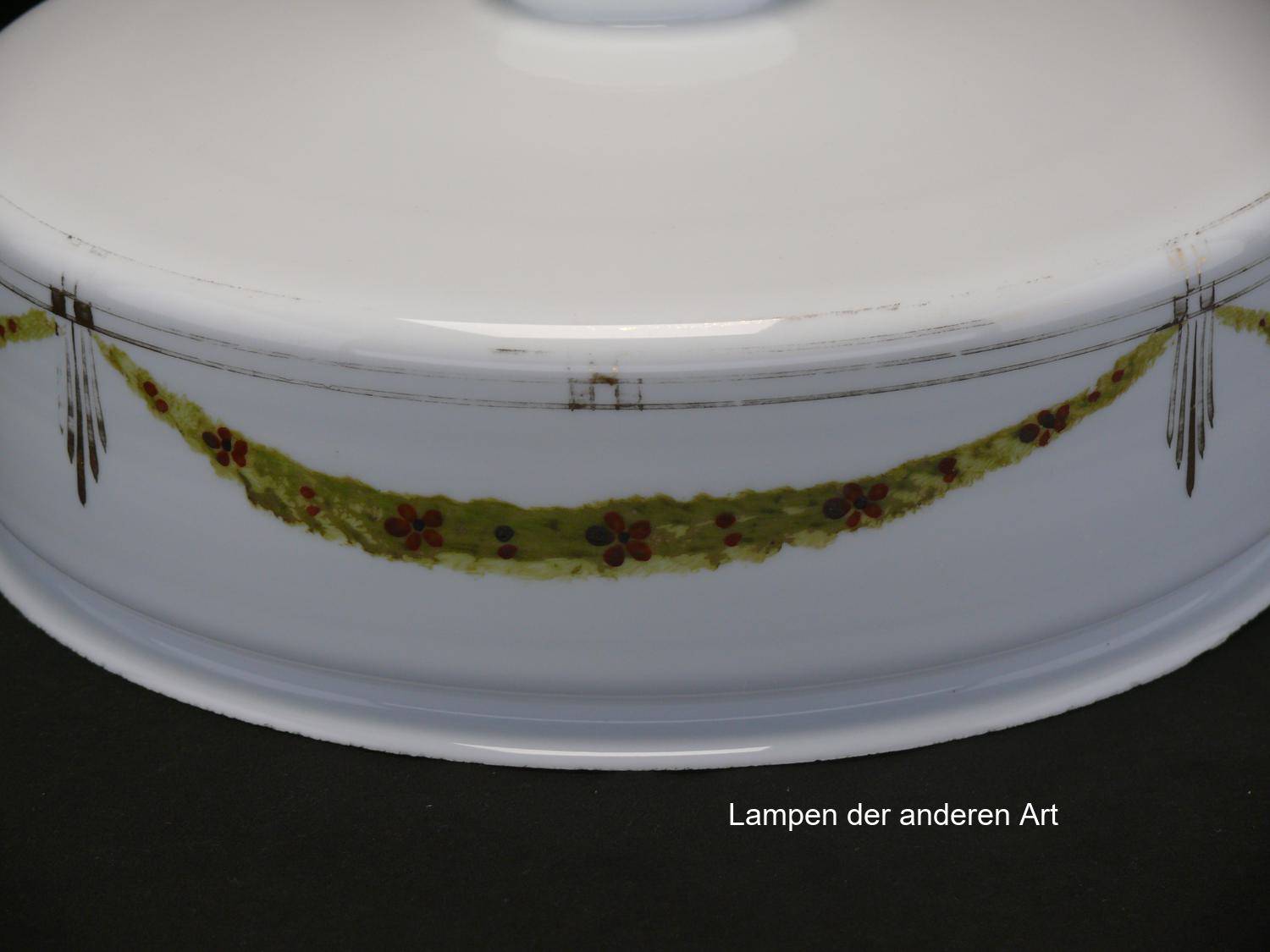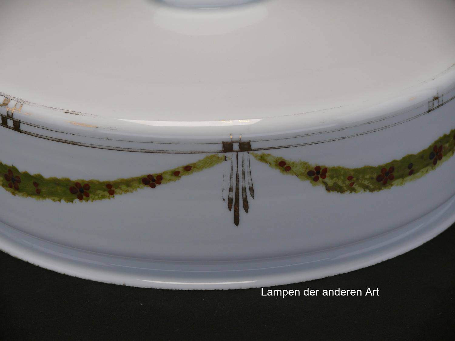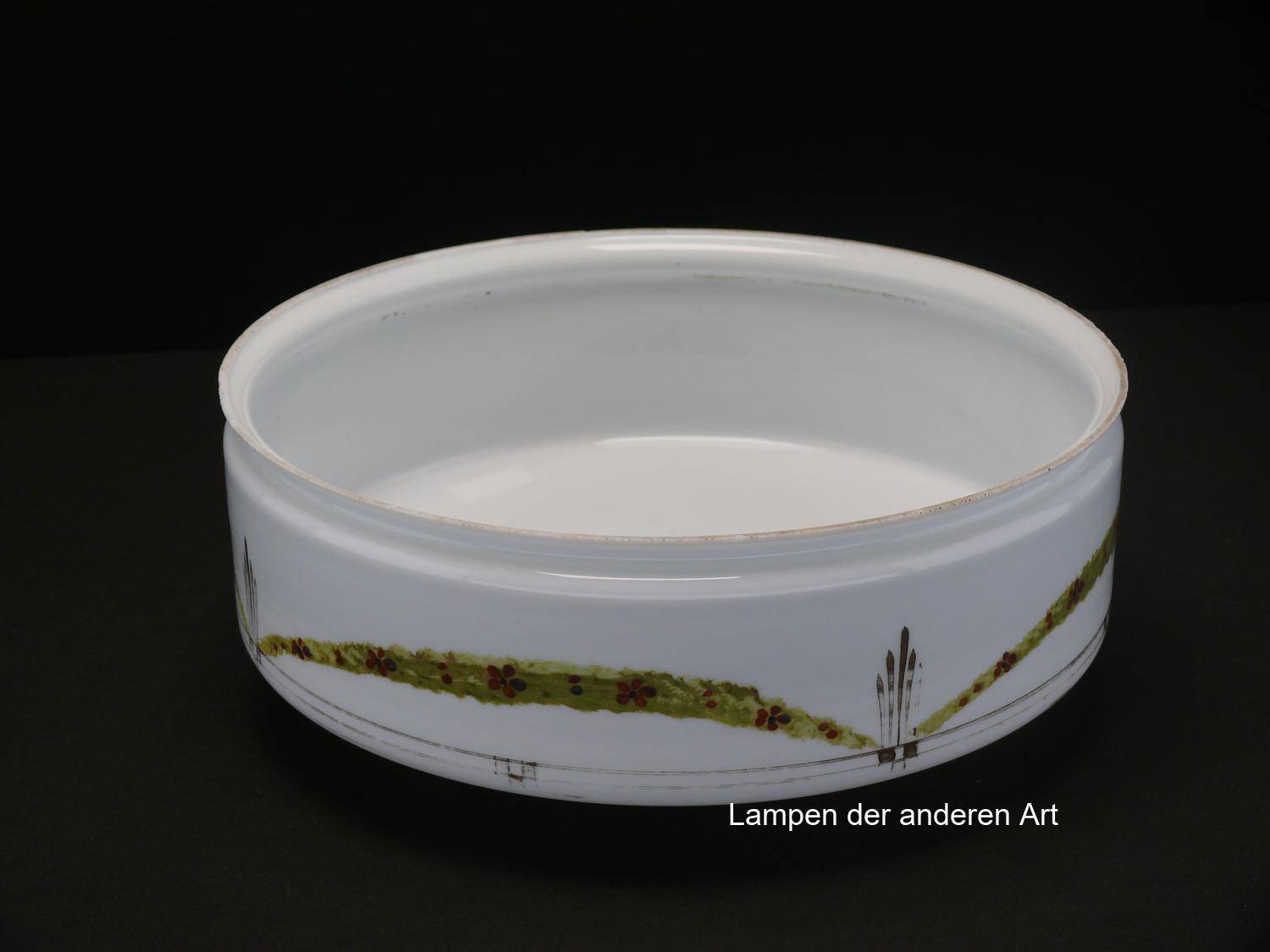 Jugendstil Lampenschirm, antiker Glasschirm opal weiß, Verzierung umlaufende Girlande grün mit kleinen Blümchen, Rand der Schulter mit Golddekor - aber stark berieben - siehe Fotos, Nostalgie Ersatzschirm, D: ca. 26cm, H: ca.9cm, Glashalter Griffrand 6cm - gemessen 5,9cm, am unteren Rand besteht die Möglichkeit Perlfransen anzubringen