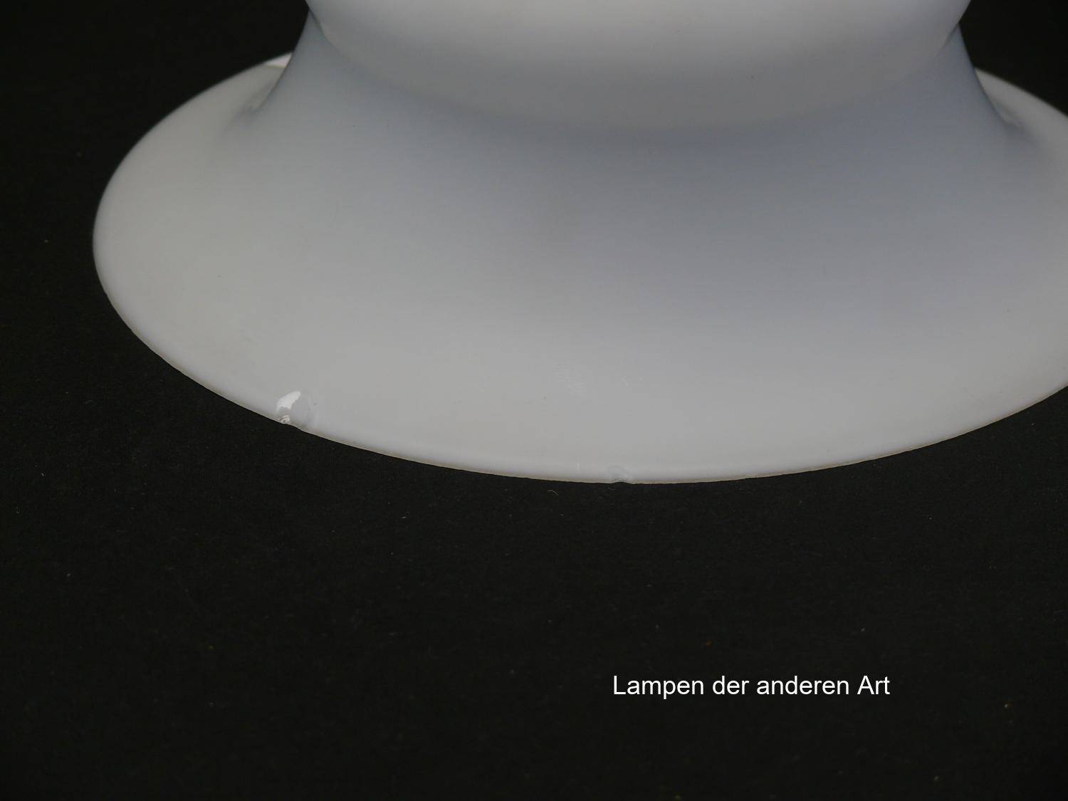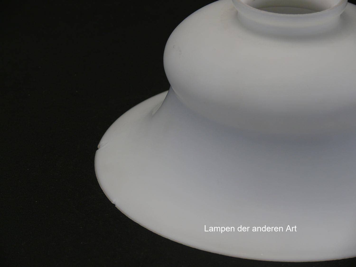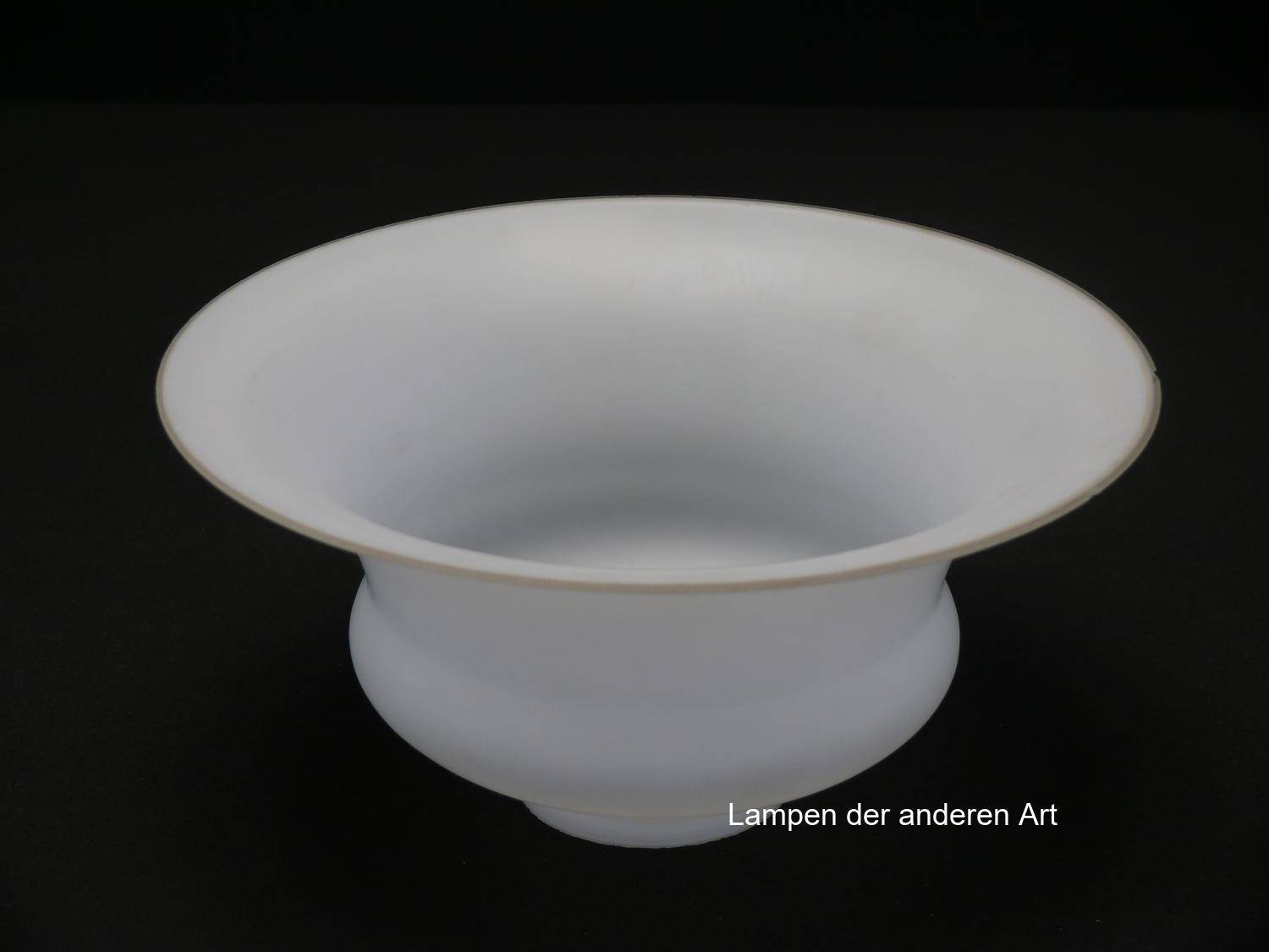 Jugendstil Lampenschirm gebraucht, opal satiniertes Glas, mittig geschnürte Wandung, zum Rand hin weit aufgezogen, Nostalgie Ersatzglas D: ca.19cm, H: ca.9cm, Glashalter Griffrand Ø 6cm - gemessen 5,7cm, 2 Chips am Rand - siehe Foto
