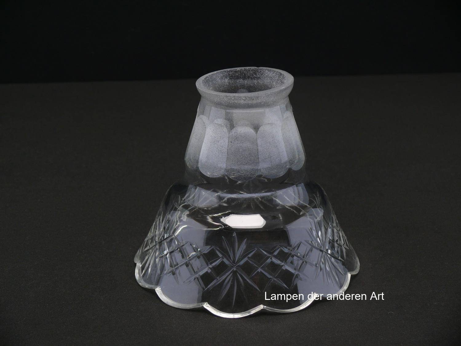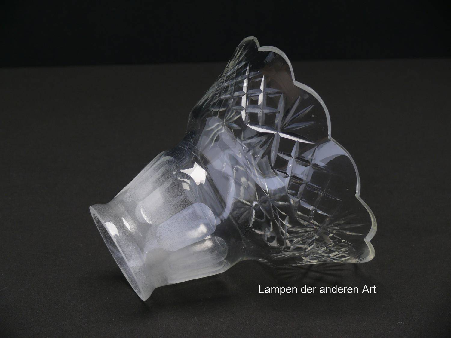 Jugendstil Lampenschirm gebraucht, antikes Glas im oberen Teil eisglasartig, ovale Schliffornamente, im unteren Teil klar, mittig geschnürt, ausgestellte Wandung mit verbundenem Keilschliff, Nostalgieglas, Ersatzschirm für alte Lampen, D: ca.14cm, H: ca.12cm, Glashalter Griffrand 6cm - gemessen 5,7cm