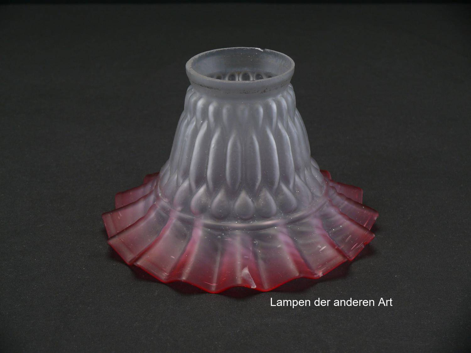 antiker Jugendstil Lampenschirm gebraucht, geweiteter Glaszylinder grau satiniert, Oberfläche reliefiert, aufgezogener gewellter Rand in rot, Nostalgie Ersatzglas, D: ca.16cm, H: ca.10cm, Glashalter Griffrand Ø 6cm - gemessen 5,7cm, einige Minichips am Rand - siehe Fotos