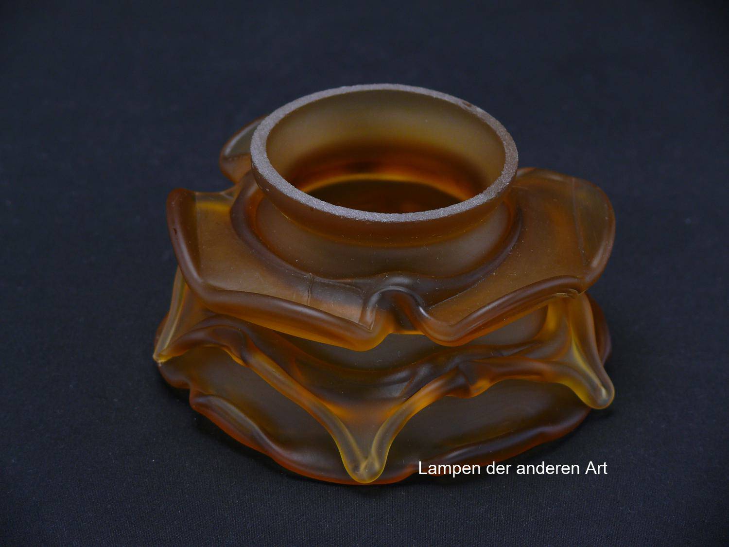 Jugendstil Lampenschirm gebraucht, Glas, Form einer Rosenblüte, goldsatiniert, 3-fach gestuft, versetzt angordnete Blütenblätter, Ersatzschirm für Nostalgielampen, D: ca.10cm H: ca.5cm, Griffrand Glashalter Ø 6cm - gemessen 5,6cm, Spitze eines Blütenblattes beschädigt - siehe Foto