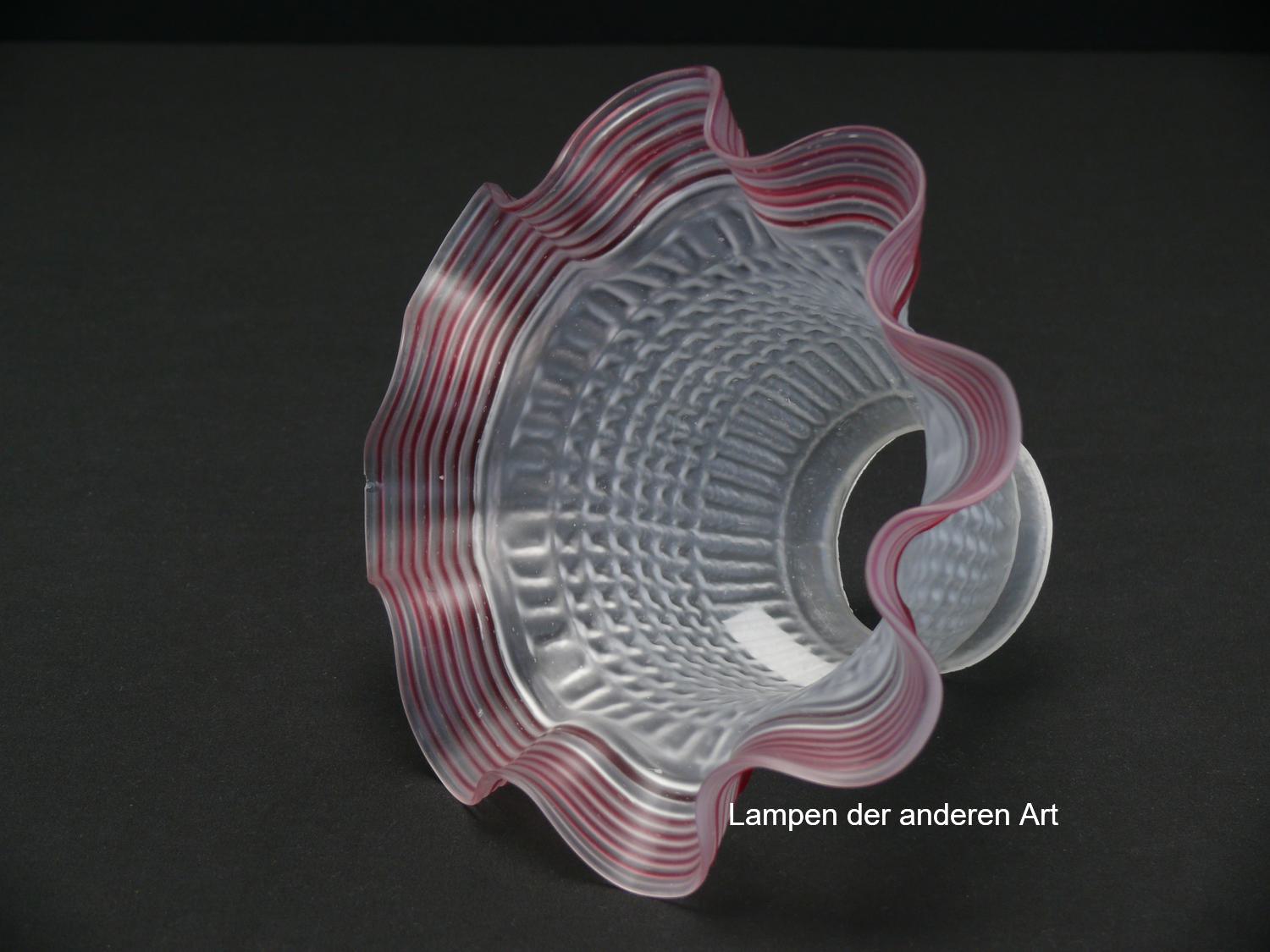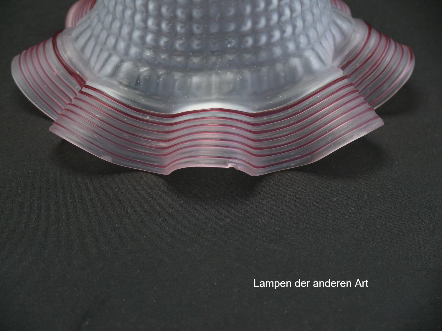 antiker Jugendstil Lampenschirm gebraucht, geweiteter Glaszylinder grau satiniert, Oberfläche reliefiert, aufgezogener gewellter Rand mit extra aufgelegten Glasfäden in rot verziert, Nostalgie Ersatzglas, D: ca.16cm, H: ca.11cm, Glashalter Griffrand Ø 6cm - gemessen 5,8cm, minimaler Chip am Rand - siehe Fotos