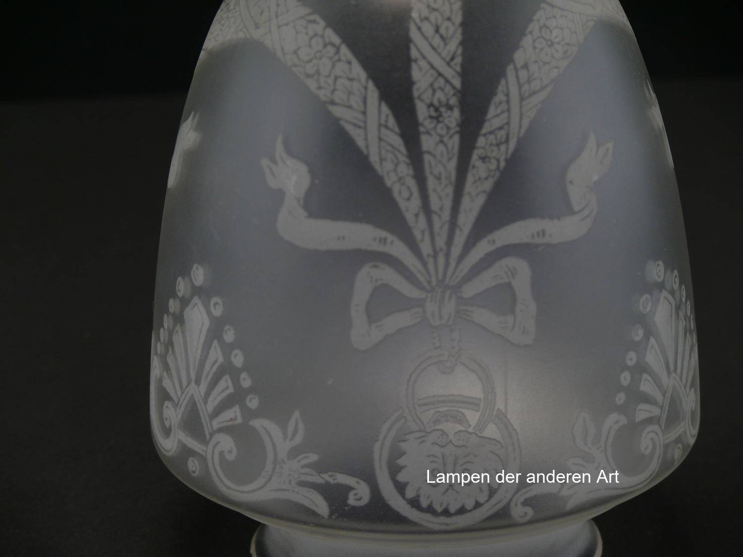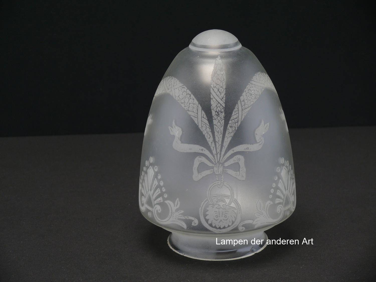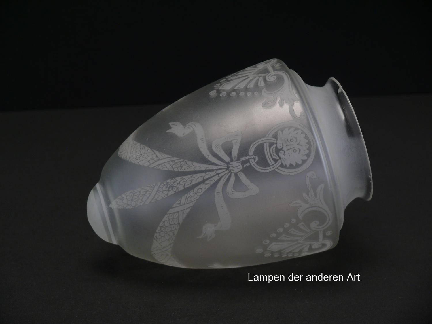 2-er Set Jugendstil Lampenschirm gebraucht, Glas grau satiniert, Zapfe in der Spitze geschnürt, Oberfläche geätzt, Dekor u.a. Schleifen, Nostalgieschirm, Ersatzglas für alte Lampen, D: ca.12cm, H: ca.17cm, Glashalter Griffrand 8cm - gemessen 7,9cm,