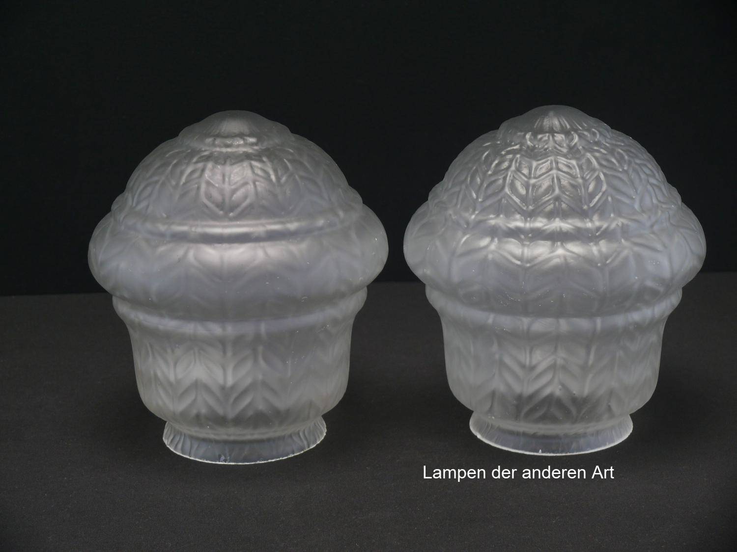 2-er Set Jugendstil Lampenschirm gebraucht, Glas grau satiniert, Zapfe mehrfach eingeschnürt, kuppelartiger Abschluss, Oberflächenstruktur Rhombenmuster, Nostalgieschirm, Ersatzglas für alte Lampen, D: ca.13cm, H: ca.15cm, Glashalter Griffrand 8cm - gemessen 7,8cm