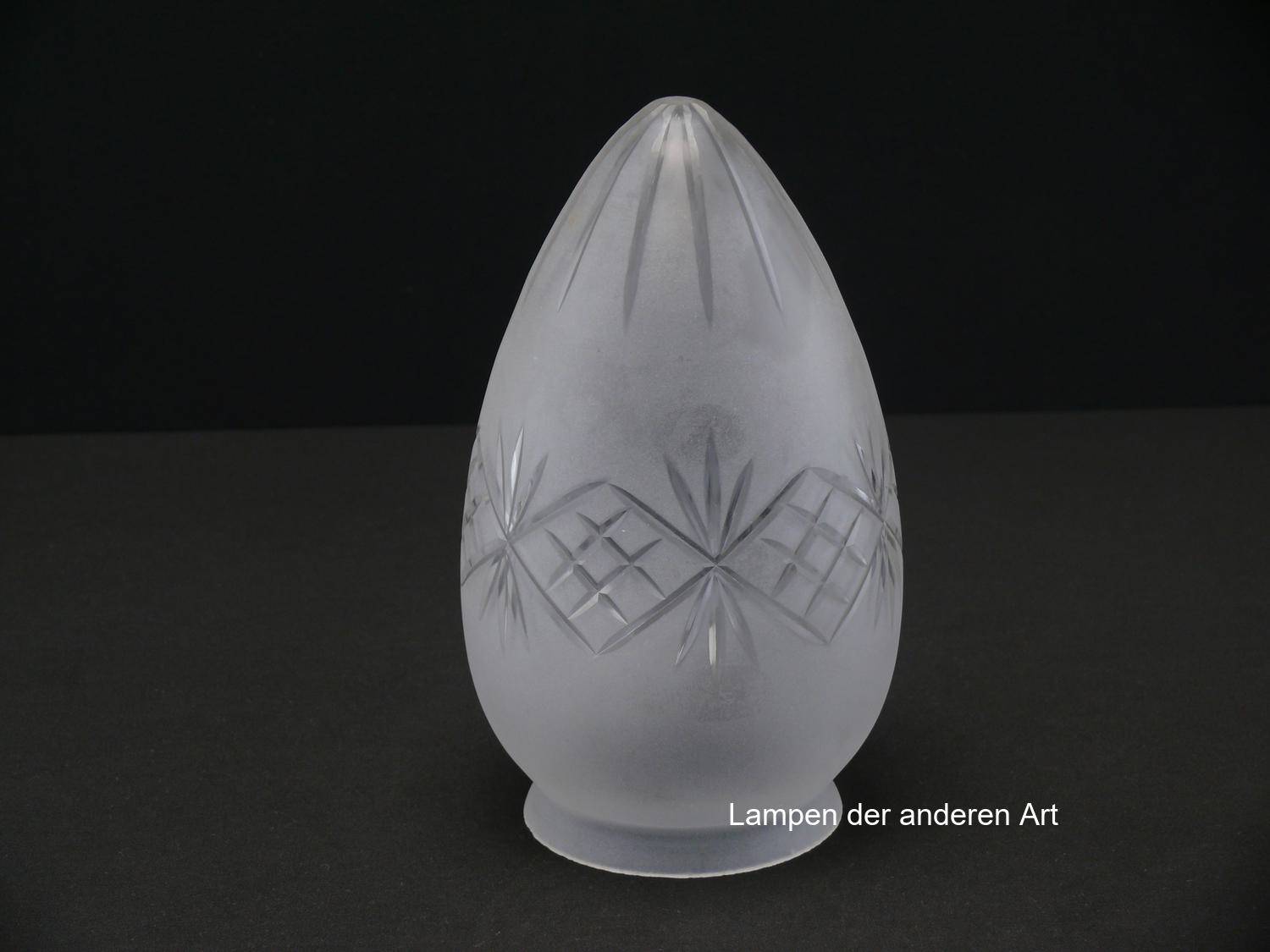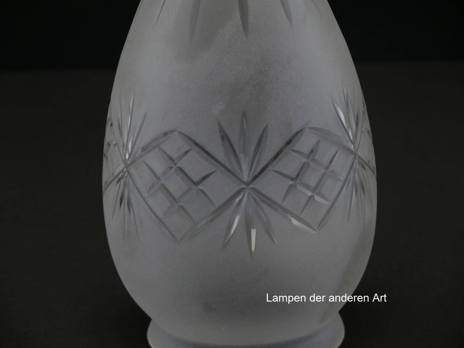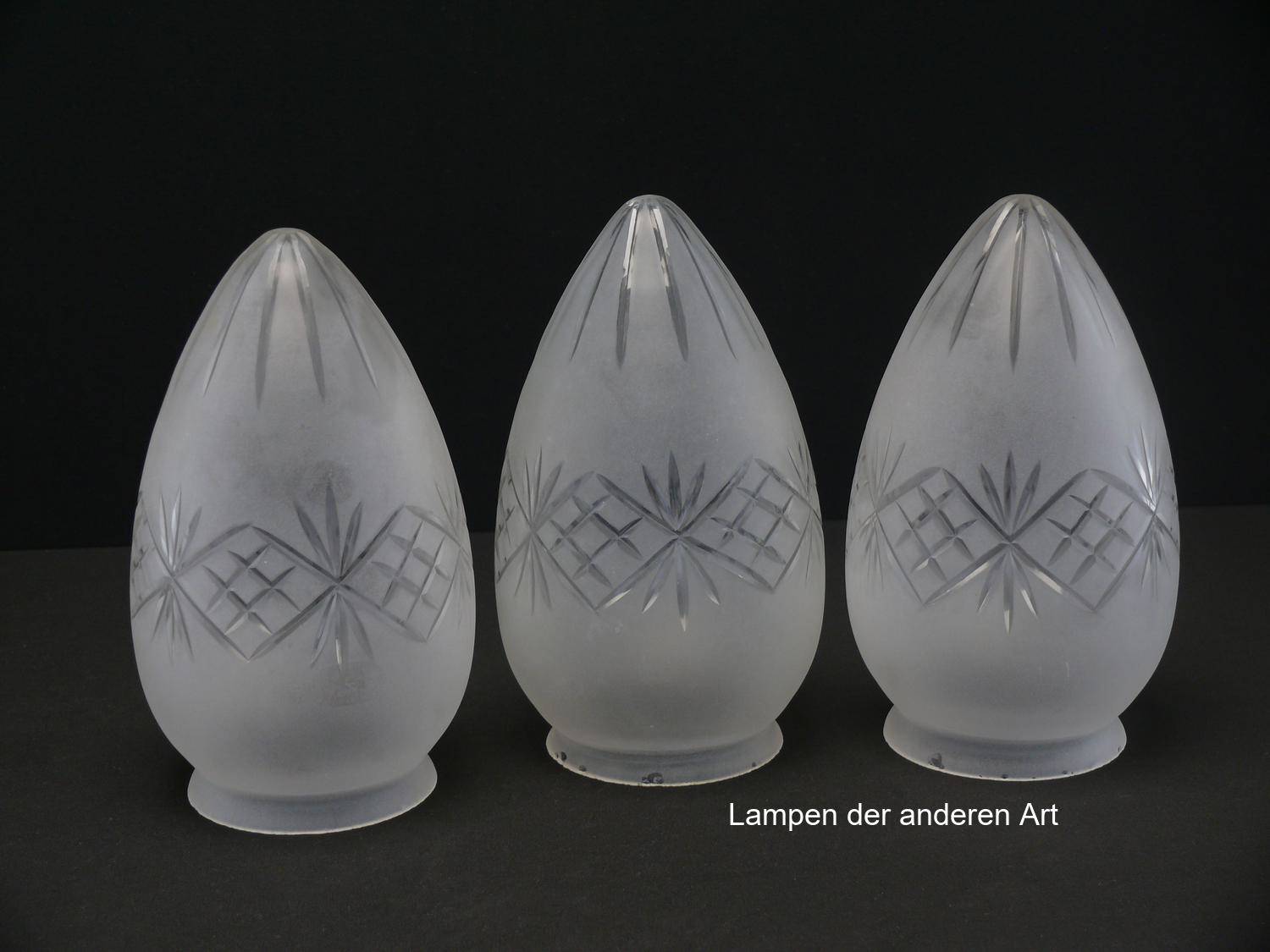 Jugendstil Lampenschirm gebraucht, im 3-er Set, Klarglas satiniert, Zapfenform, Wandungsmitte umlaufendes Schmuckband mit geschliffenen Ornamenten, Strahlenmuster, Zapfenspitze schliffverziert, Nostalgieglas, Ersatzschirm, D: ca.10cm, H: ca.18cm, Glashalter Griffrand 8cm - gemessen 7,8cm