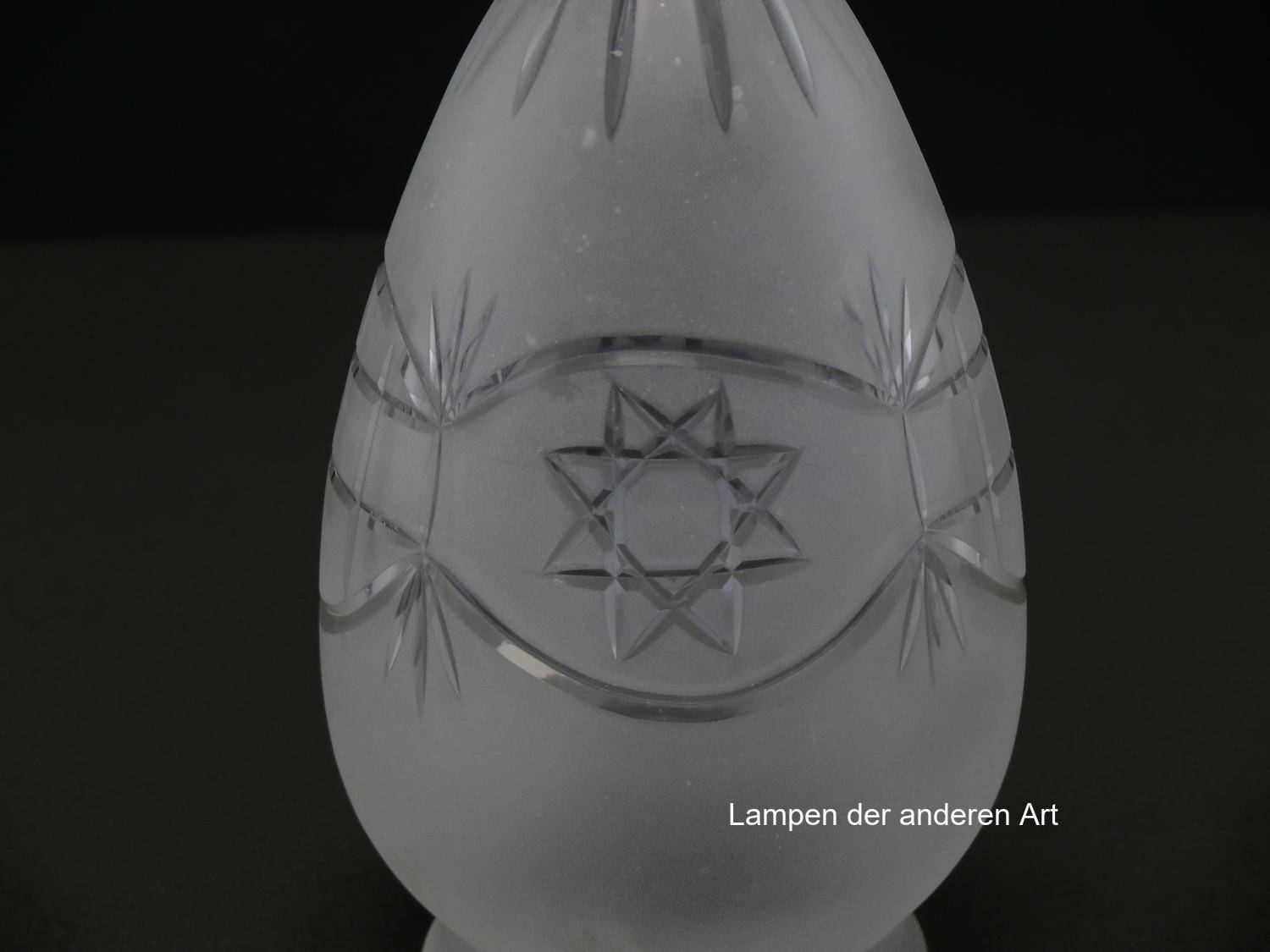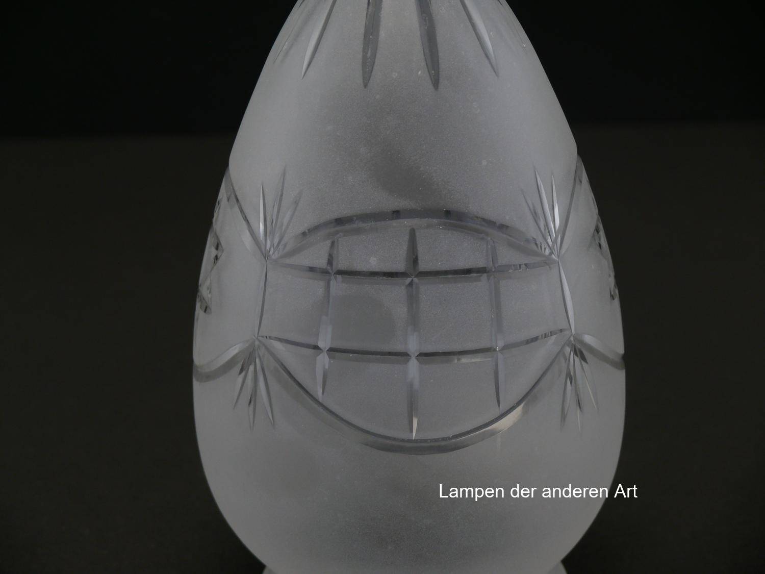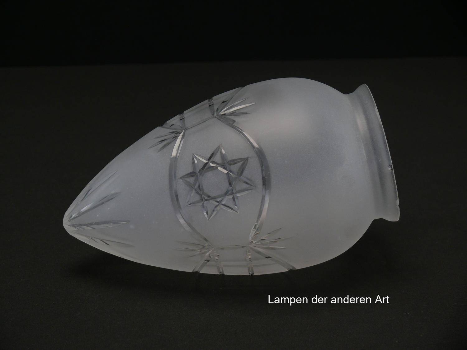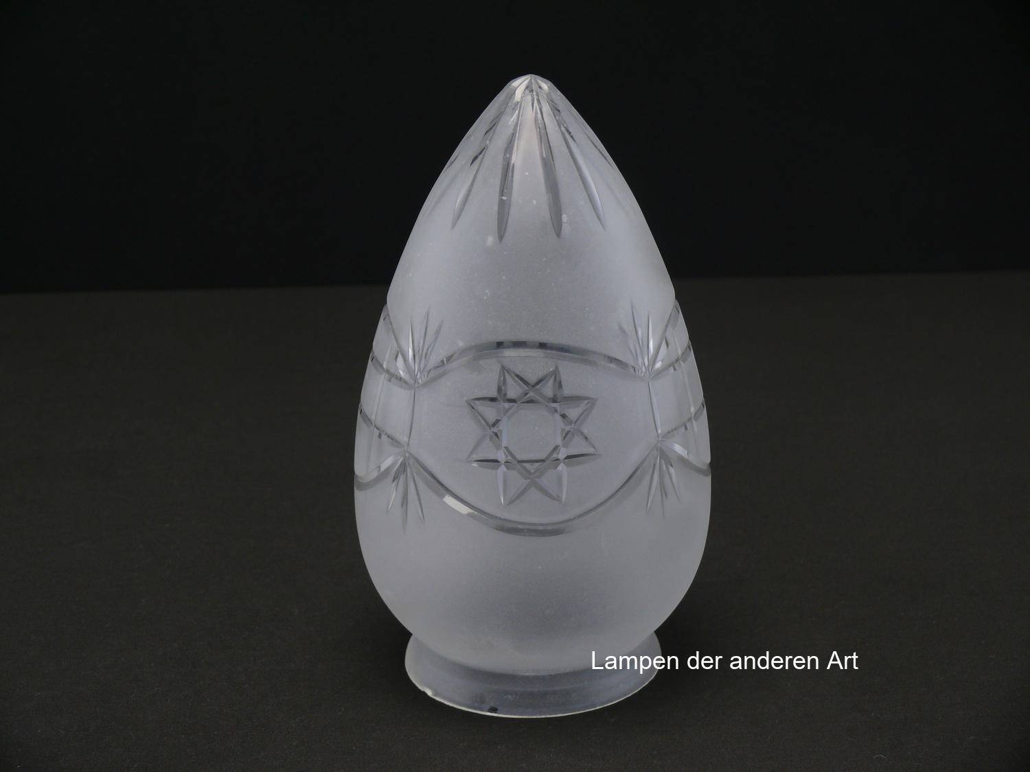 Jugendstil Lampenschirm gebraucht, im 3-er Set, Klarglas satiniert, Zapfenform, Wandungsmitte umlaufendes Schmuckband mit geschliffenen Ornamenten, Oktagrame und Quadrate im Wechsel, umschlossen von geschwungenen Linien in Keilschliff, final Sternschliff, Nostalgieglas, Ersatzschirm, D: ca.10cm, H: ca.18cm, Glashalter Griffrand 8cm - gemessen 7,8cm