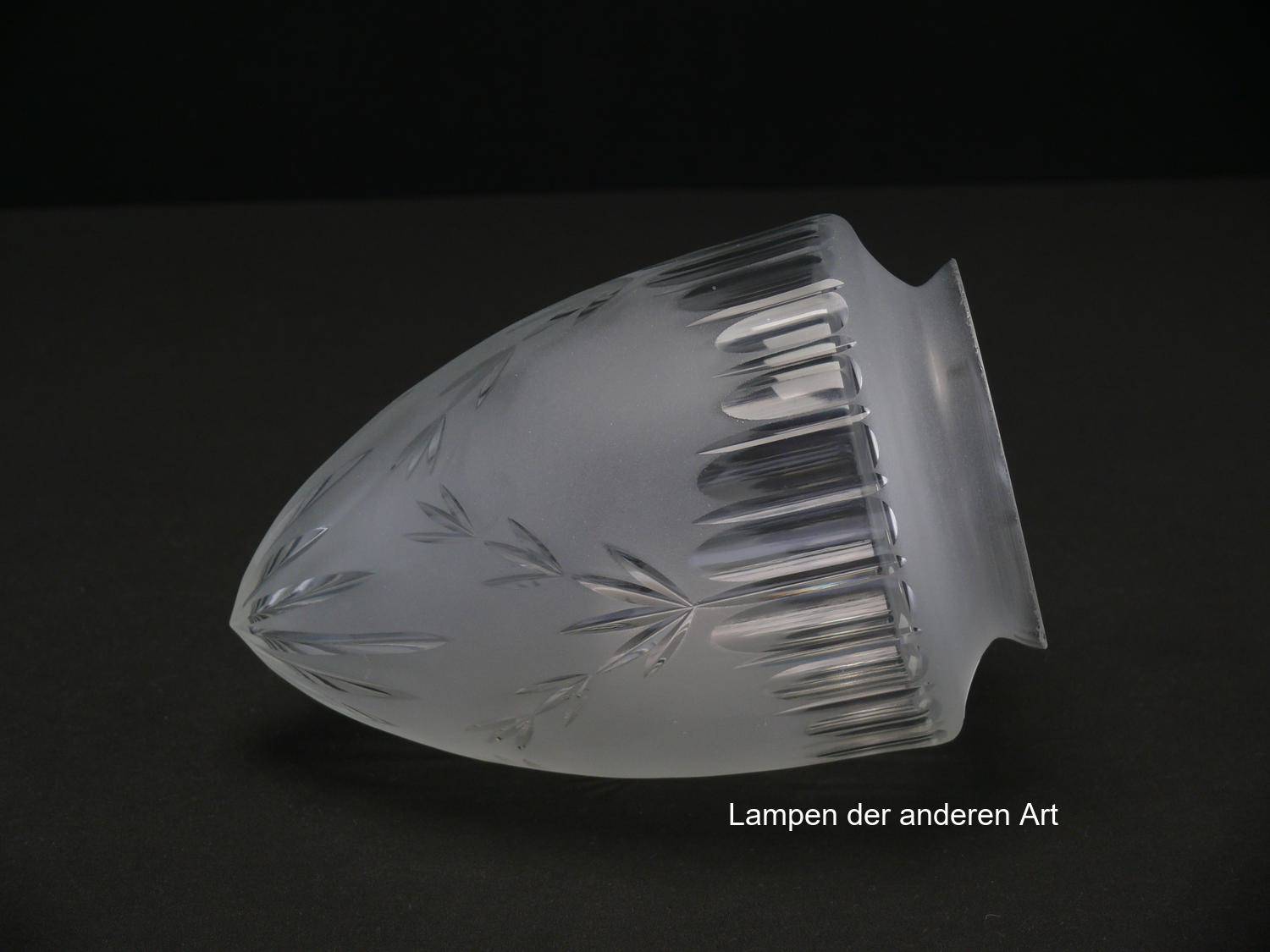 Jugendstil Lampenschirm gebraucht, antikes Glas grau satiniert, als Zapfe ausgeformt, Wandung an der Schulter mit Keilschliff verziert, mittig stilisierte Zweige geschliffen, Spitze im Unterteil Dekor Strahlenschliff, Nostalgieglas, Ersatzschirm für alte Lampen, D: ca.11cm, H: ca.15cm, Glashalter Griffrand 8cm - gemessen 8cm