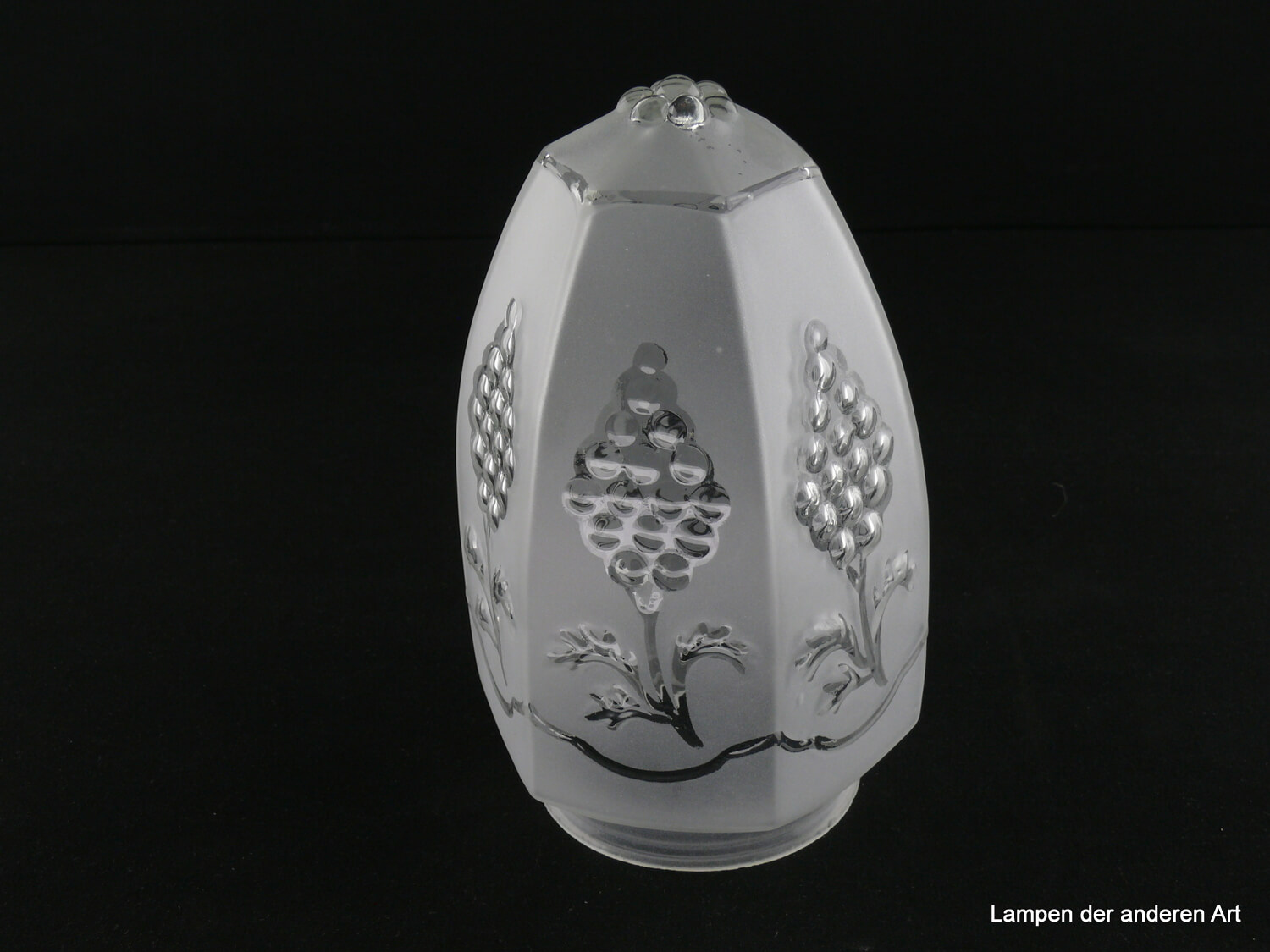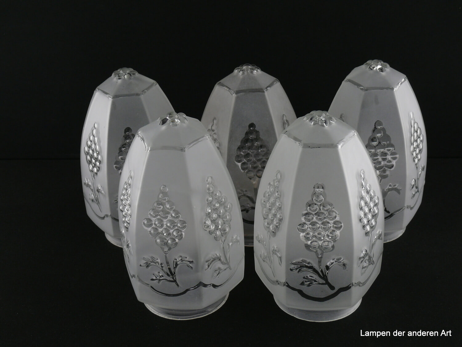 Jugendstil Lampenschirm gebraucht, Glas, Form einer Olive, kantige Wandung, auf sechs Flächen je eine klare plastische Weintraube umgeben von satiniertem Grund, finaler Abschluss Blume Klarglas, Nostalgie Ersatzschirm D: 11cm, H: 17cm, Glashalter Griffrand 8cm, Rarität - äußerst seltenes Gläserset bestehend aus 5 alten Gläsern