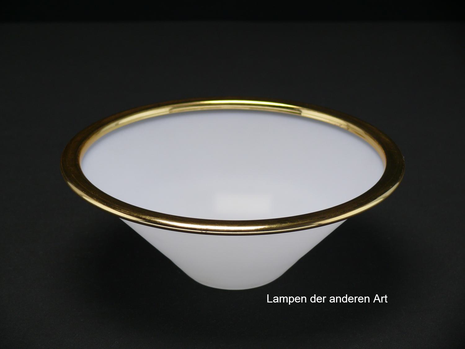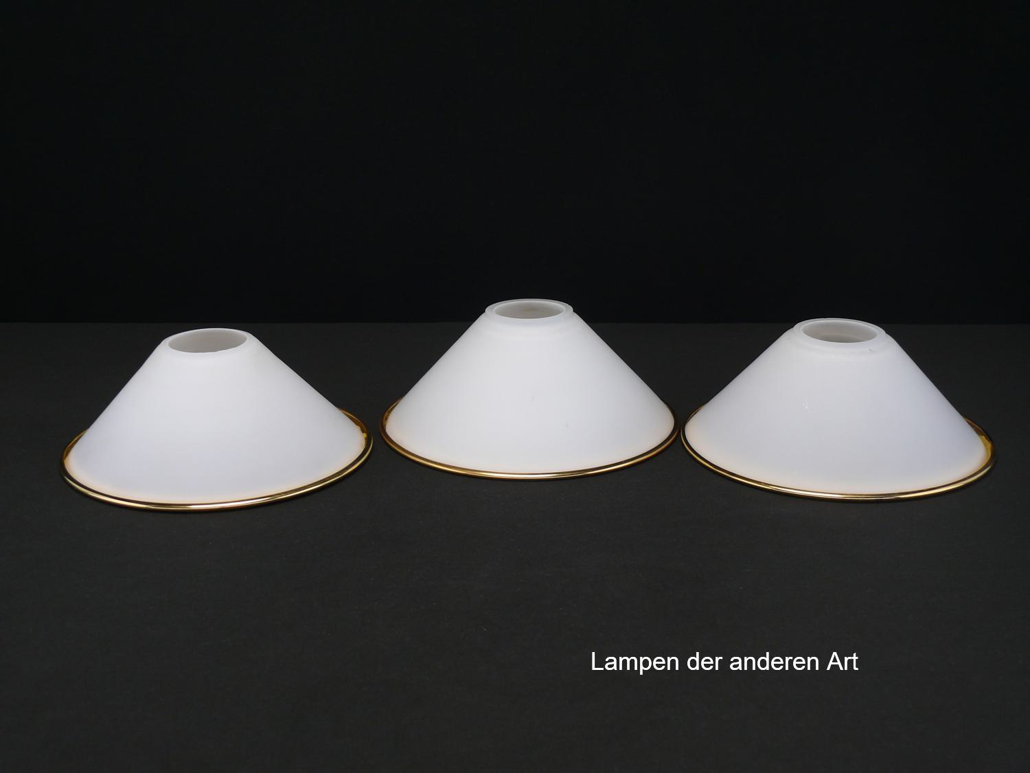 3-er Set Lampenschirm gebraucht, Kegelform, opal weiß, Oberfläche satiniert, Metallrand goldfarben, Nostalgie Ersatzglas, D: ca.18cm, H: ca.7cm, Achtung kein Glashalter, Loch gemessen 38/40/42mm