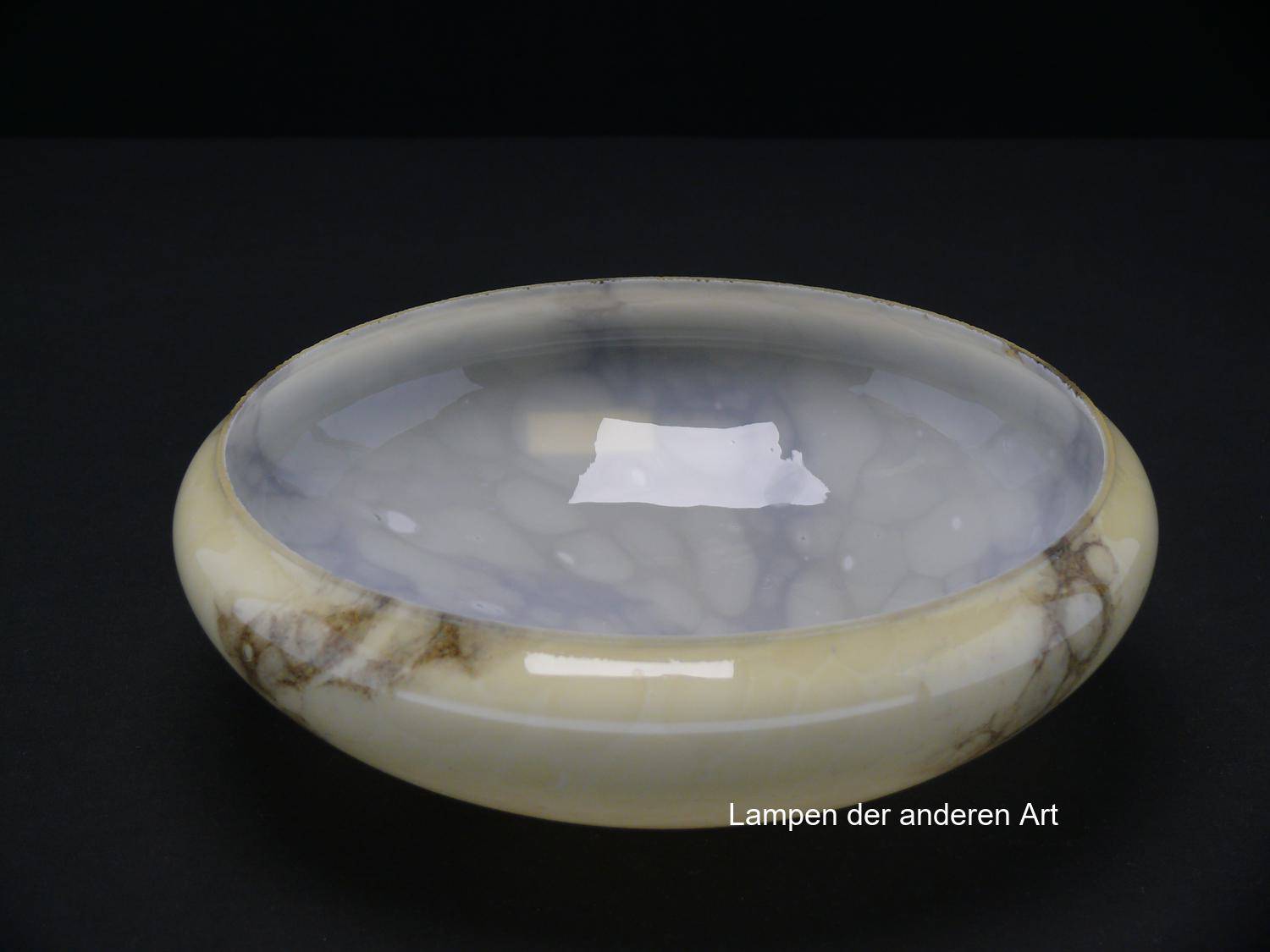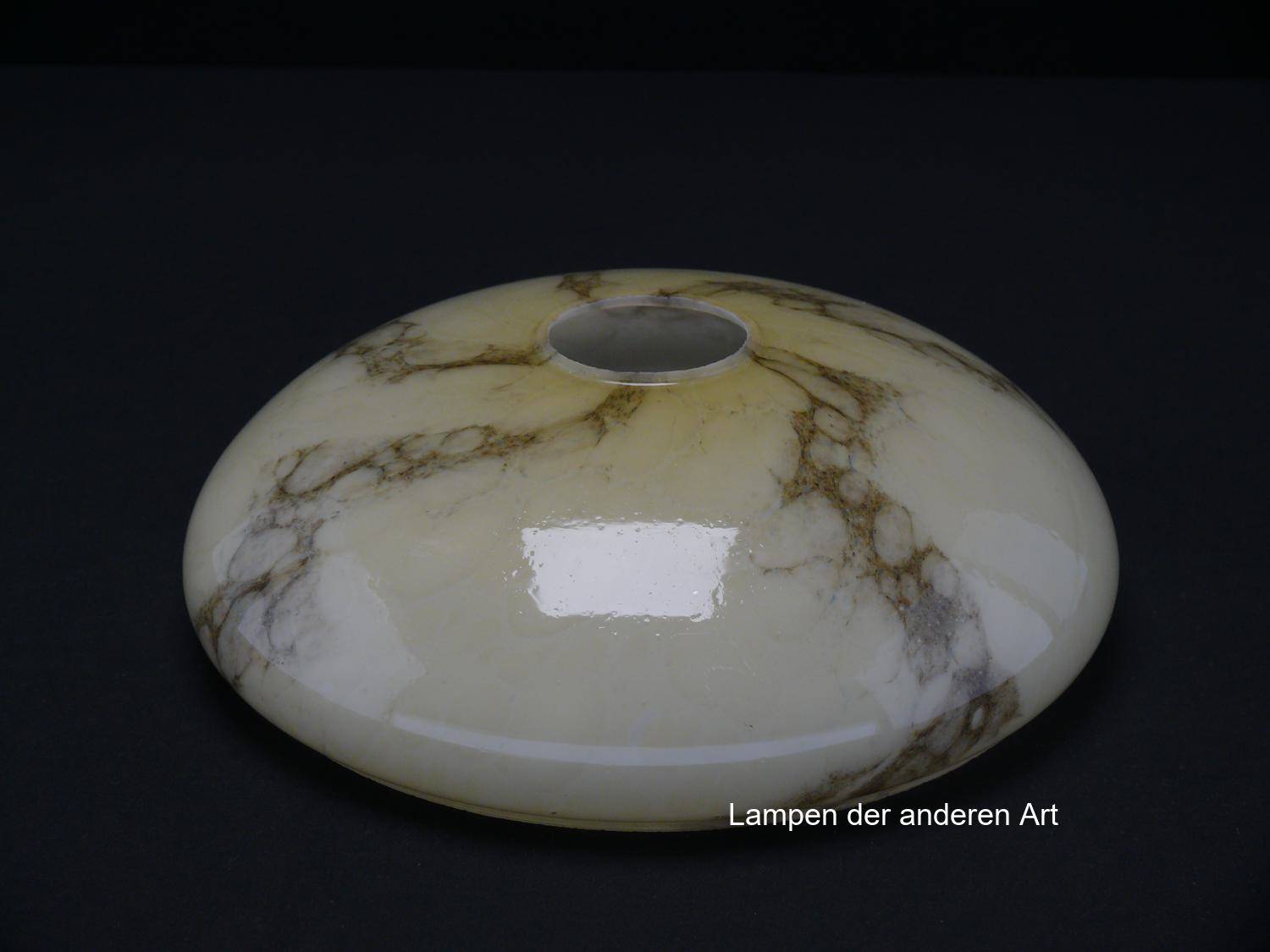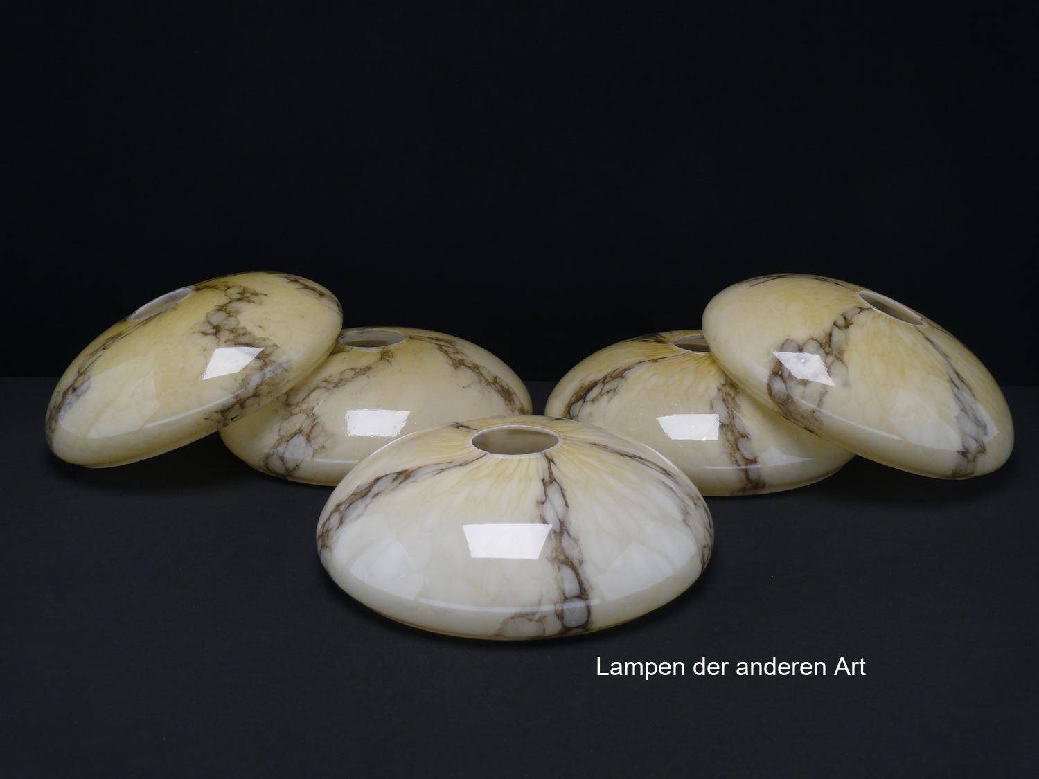 Art Deco Lampenschalen gebraucht 5-er Set, hellgelb-braun marmoriertes Glas, innen weiß, farblich zueinander passend aber verschieden marmoriert, glatte Oberfläche, Zustand und Maserung - siehe Fotos, Nostalgie Ersatzglas D: ca.22cm, H: ca.6,5cm, ohne Glashalter Griffrand, Loch 45mm - gemessen 45mm