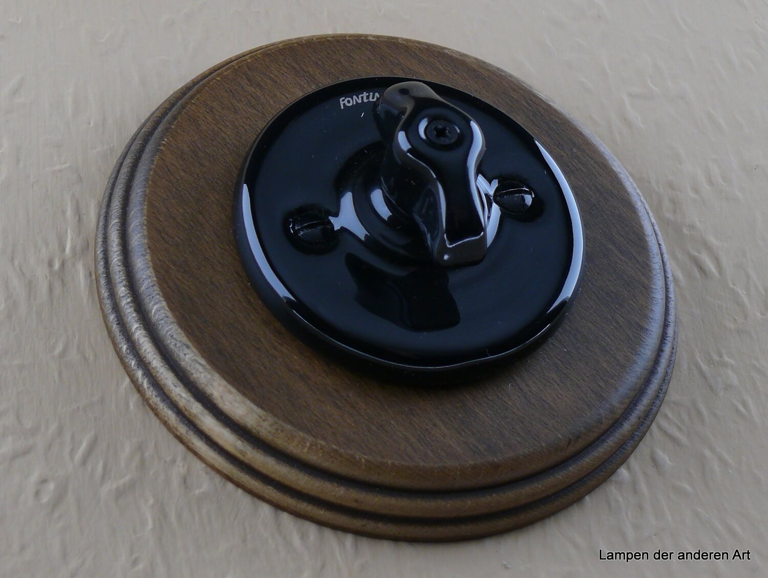 Mit seinem runden profilierten Einfachrahmen aus massivem gealtertem Buchenholz, ist er eine Hommage an den guten alten Porzellandrehschalter, der in vergangenen Zeiten weit verbreitet war. Das zeitlose Design und die hochwertigen Materialien bringen einen Hauch von Nostalgie und Eleganz in Ihre Räume.