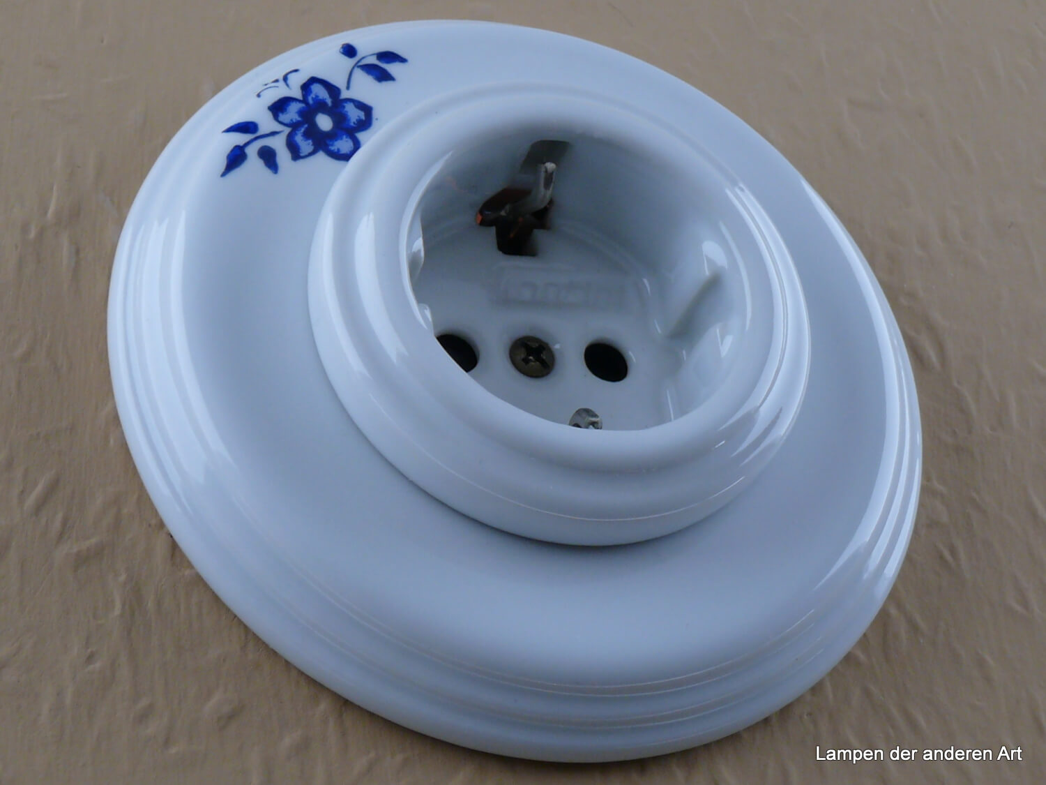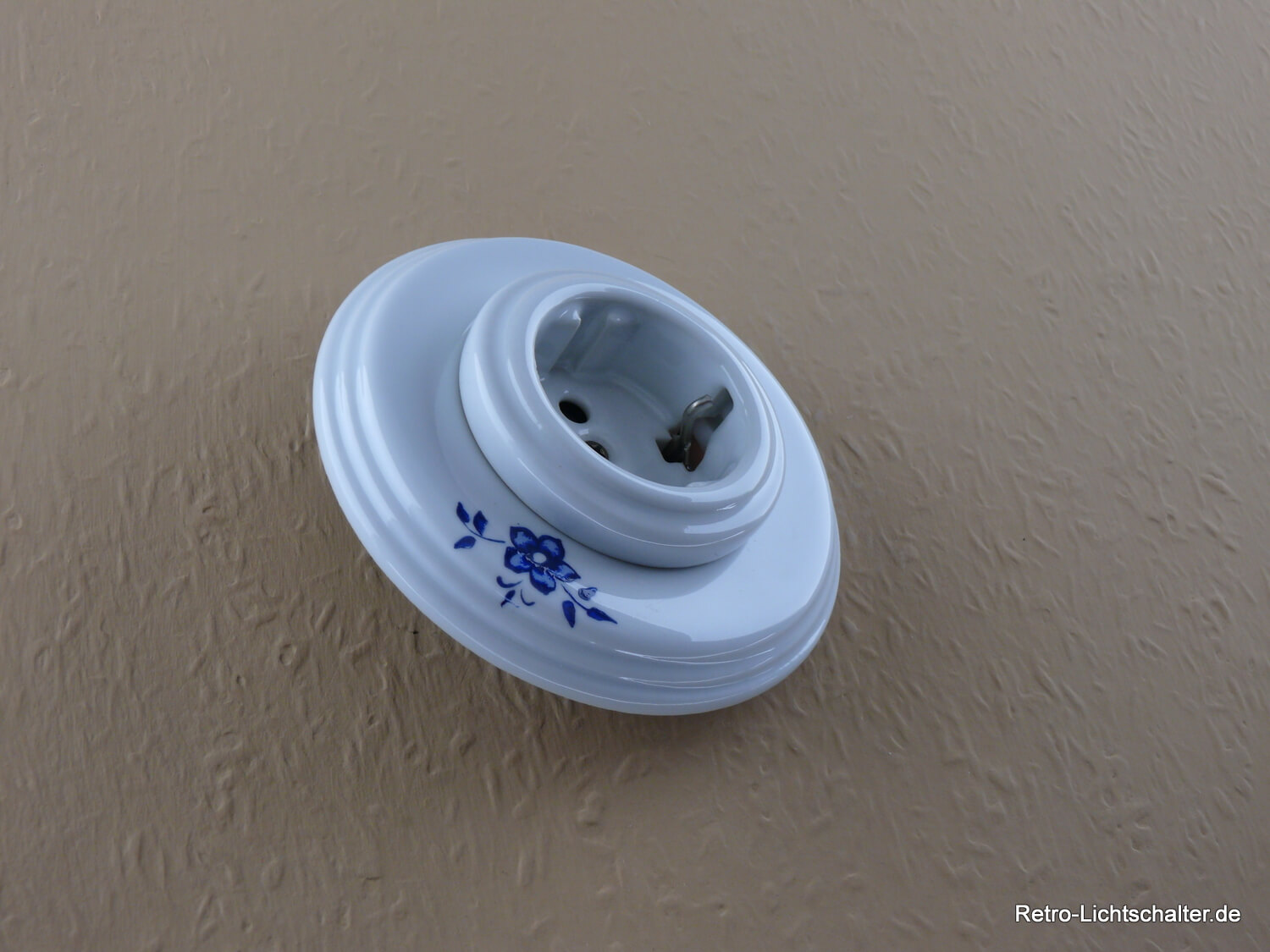 Der aus weißem Porzellan gefertigte Steckdoseneinsatz wird komplettiert von einem runden profilierten Einfachrahmen aus weißem Porzellan und dem Dekor einer einzelnen kleinen Blume in kobaltblau. Durch den Schraubklemmenanschluss ist eine einfache und sichere Installation gewährleistet. Zudem ist die Steckdose mit einem integrierten Kinderschutz ausgestattet und besitzt eine VDE Zertifizierung. Sie passt problemlos in alle gängigen Unterputzdosen und vereint Funktionalität mit einem ansprechenden Retro-Look. Natürlich können Sie diese auch in Mehrfachkombinationen z.B als 2fach Steckdose, 3fach Steckdose oder in Kombination mit den klassischen Porzellandrehschaltern über unseren Shop beziehen. Wenn Sie Fragen haben sprechen Sie uns gerne an. Wir sind eine eingetragene Elektroinstallationsfirma und kennen uns mit den Produkten bestens aus, da wie diese auch bei unseren Kunden installieren. Mit anderen Worten: Wir wissen was wir verkaufen.