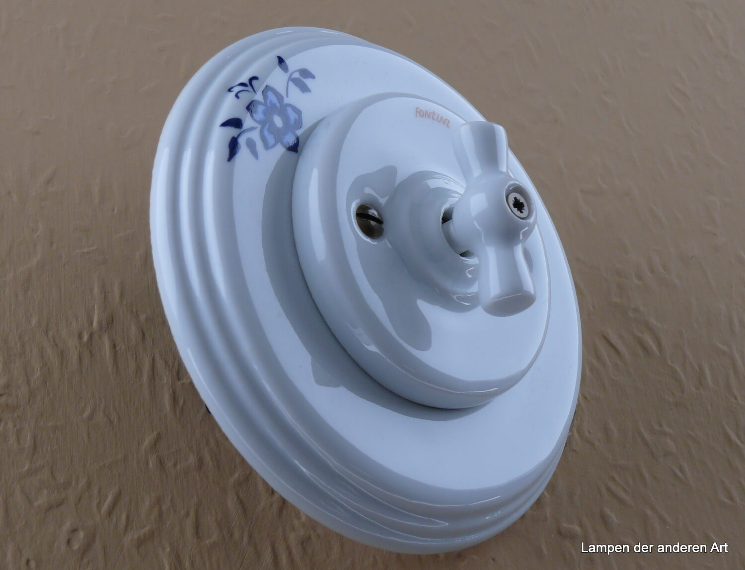 Mit seinem runden profilierten Einfachrahmen aus weißem Porzellan und dem Dekor einer einzelnen kleinen Blume in kobaltblau, ist er eine Hommage an den guten alten Porzellandrehschalter, der in vergangenen Zeiten weit verbreitet war. Das zeitlose Design und die hochwertigen Materialien bringen einen Hauch von Nostalgie und Eleganz in Ihre Räume.