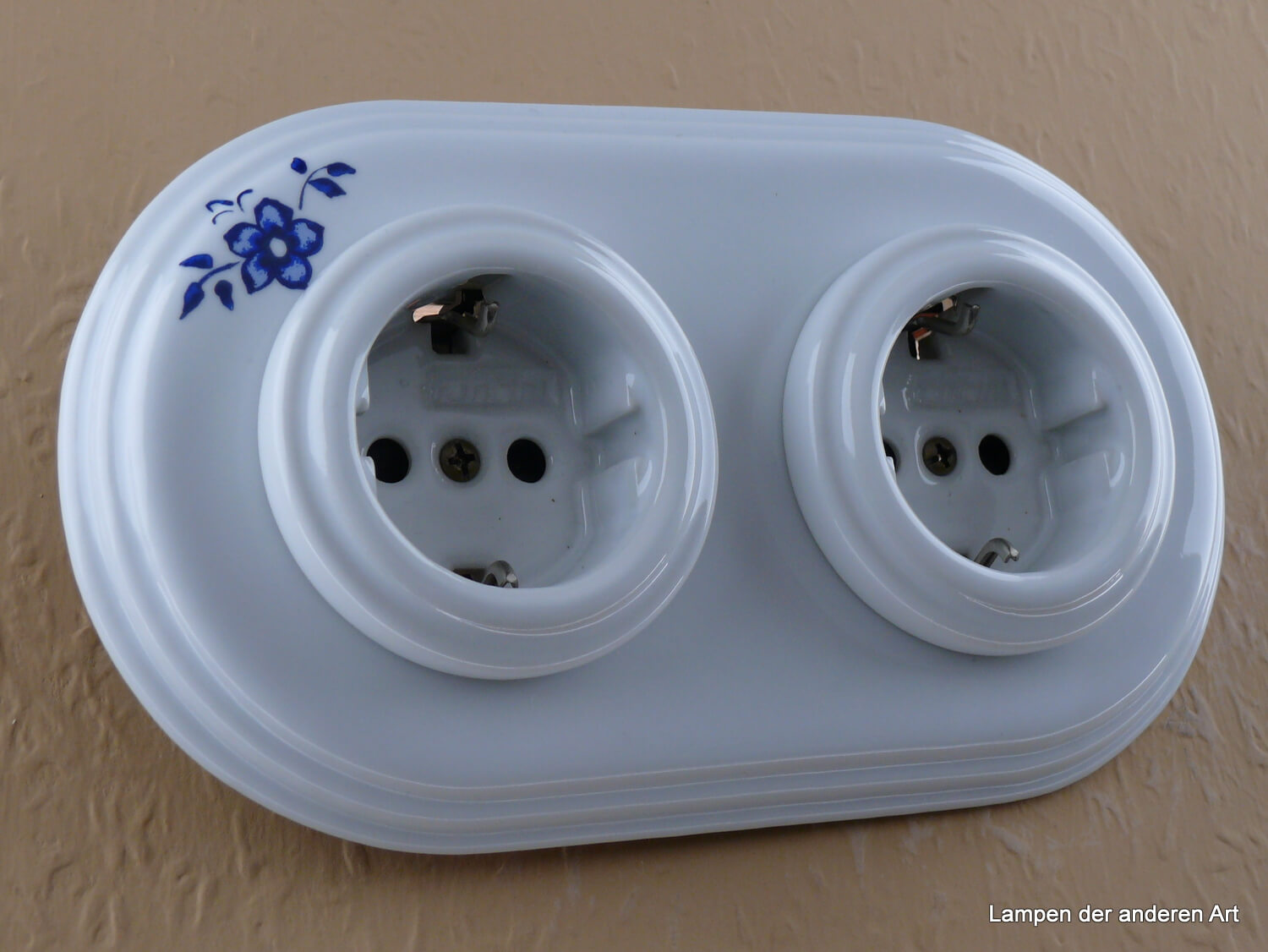 Die beiden aus weißem Porzellan gefertigten Schukosteckdoseneinsätze werden von einem ebenfalls aus weißem Porzellan gefertigten Zweifachrahmen zentriert. Dieser ist mit einer stilisierten blauen Blume dekoriert. Die Montage ist horizontal oder vertikal möglich. Durch den Steckklemmenanschluss ist eine einfache und sichere Installation gewährleistet. Zudem ist die Steckdose mit einem integrierten Kinderschutz ausgestattet und besitzt eine VDE Zertifizierung. Sie passt problemlos in alle gängigen Unterputzdosen und vereint Funktionalität mit einem ansprechenden Retro-Look. Natürlich können Sie diese auch in anderen Kombinationen z.B als 1fach Steckdose, 3fach Steckdose oder in Kombination mit den klassischen Porzellandrehschaltern über unseren Shop beziehen.