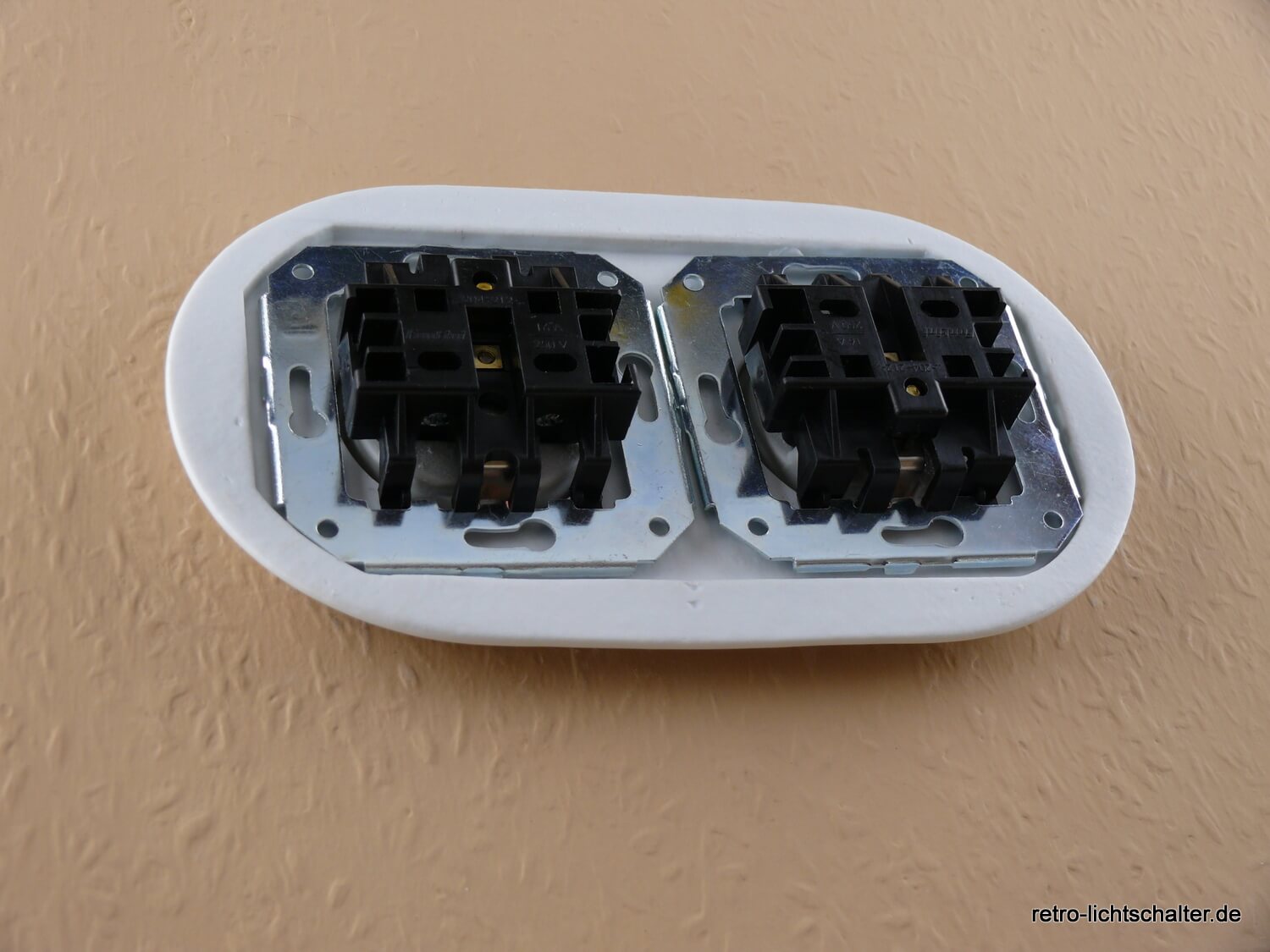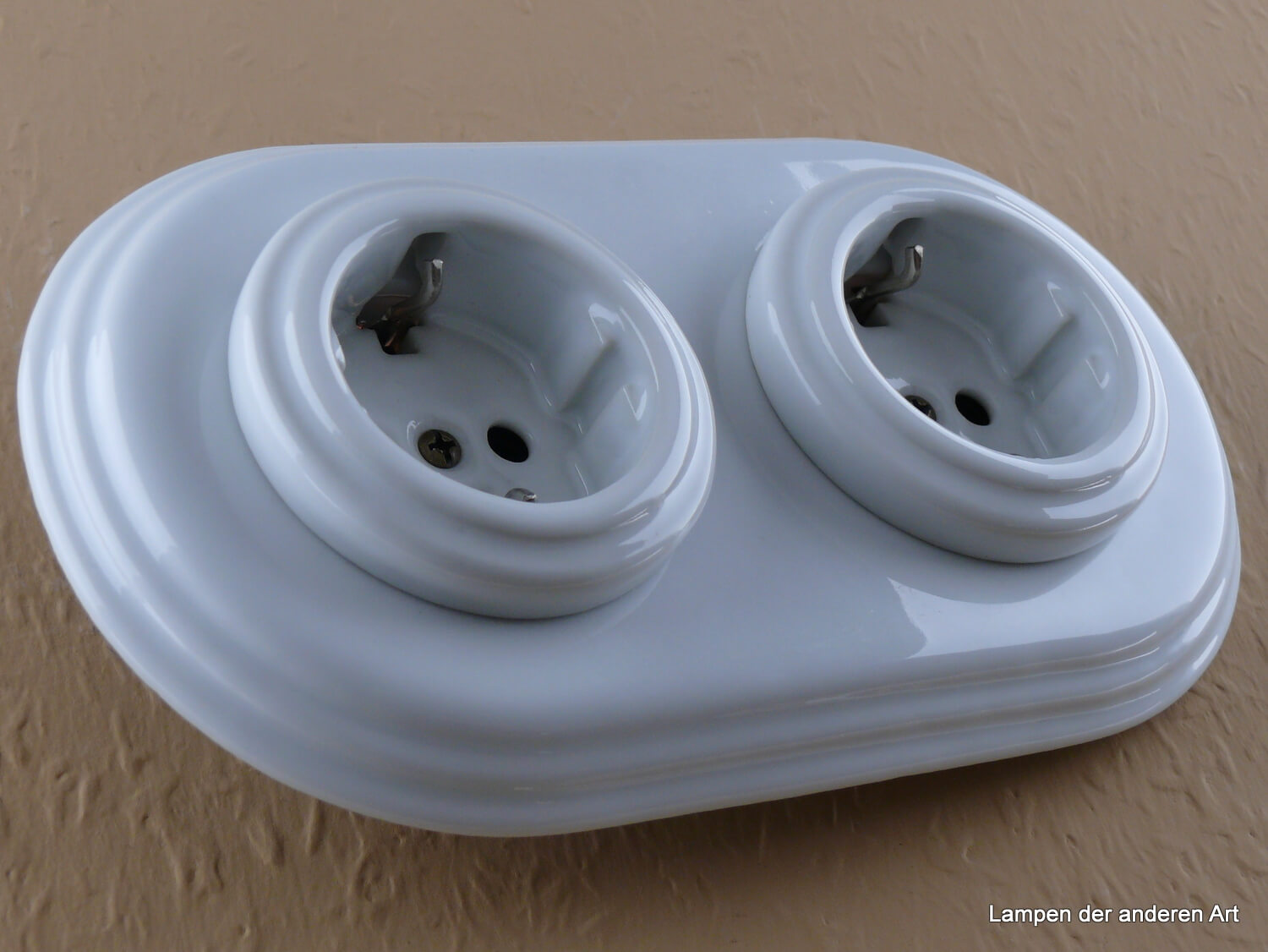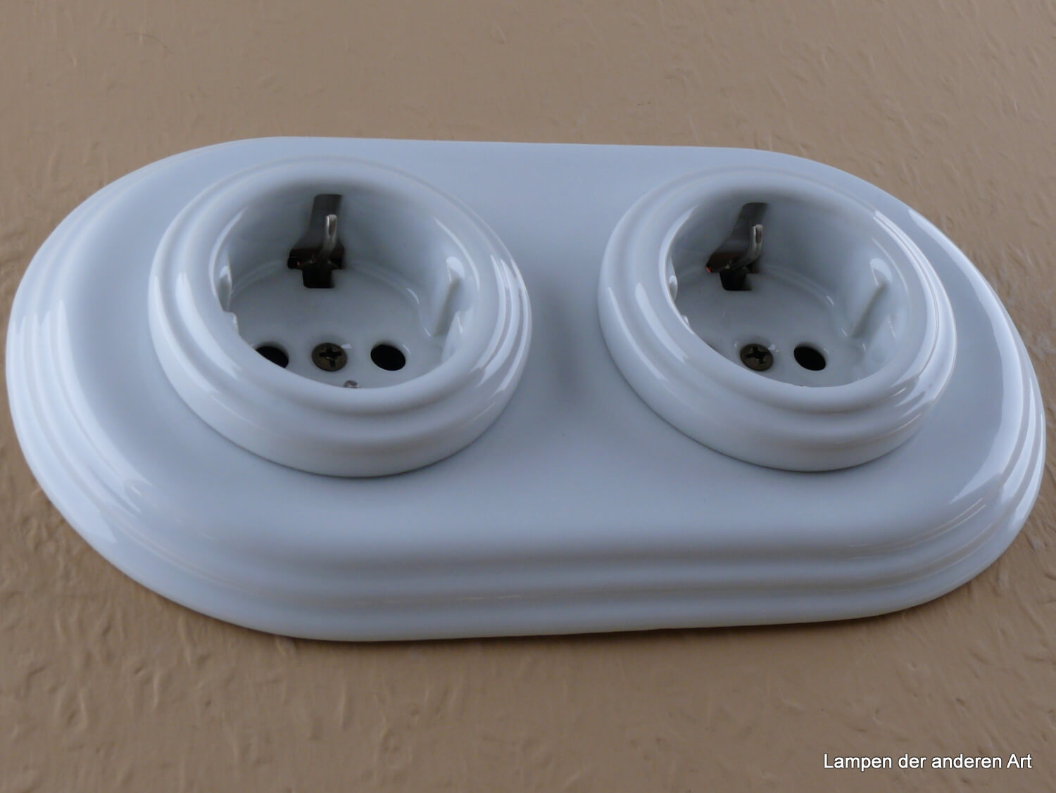 Die beiden aus weißem Porzellan gefertigten Schukosteckdoseneinsätze werden von einem ebenfalls aus weißem Porzellan gefertigten Zweifachrahmen zentriert. Die Montage ist horizontal oder vertikal möglich. Durch den Steckklemmenanschluss ist eine einfache und sichere Installation gewährleistet. Zudem ist die Steckdose mit einem integrierten Kinderschutz ausgestattet und besitzt eine VDE Zertifizierung. Sie passt problemlos in alle gängigen Unterputzdosen und vereint Funktionalität mit einem ansprechenden Retro-Look. Natürlich können Sie diese auch in anderen Kombinationen z.B als 1fach Steckdose, 3fach Steckdose oder in Kombination mit den klassischen Porzellandrehschaltern über unseren Shop beziehen.