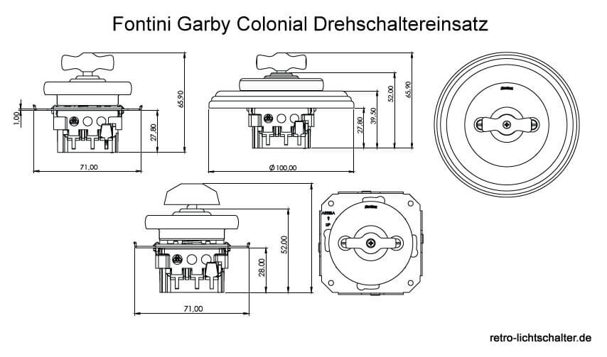 Garby Colonial Porzellan Retro Schalter-Steckdosenkombination von Fontini, bestehend aus Aus-Wechsel-Porzellandrehschalter schwarz mit einem Knebel aus patiniertem Messing sowie einem