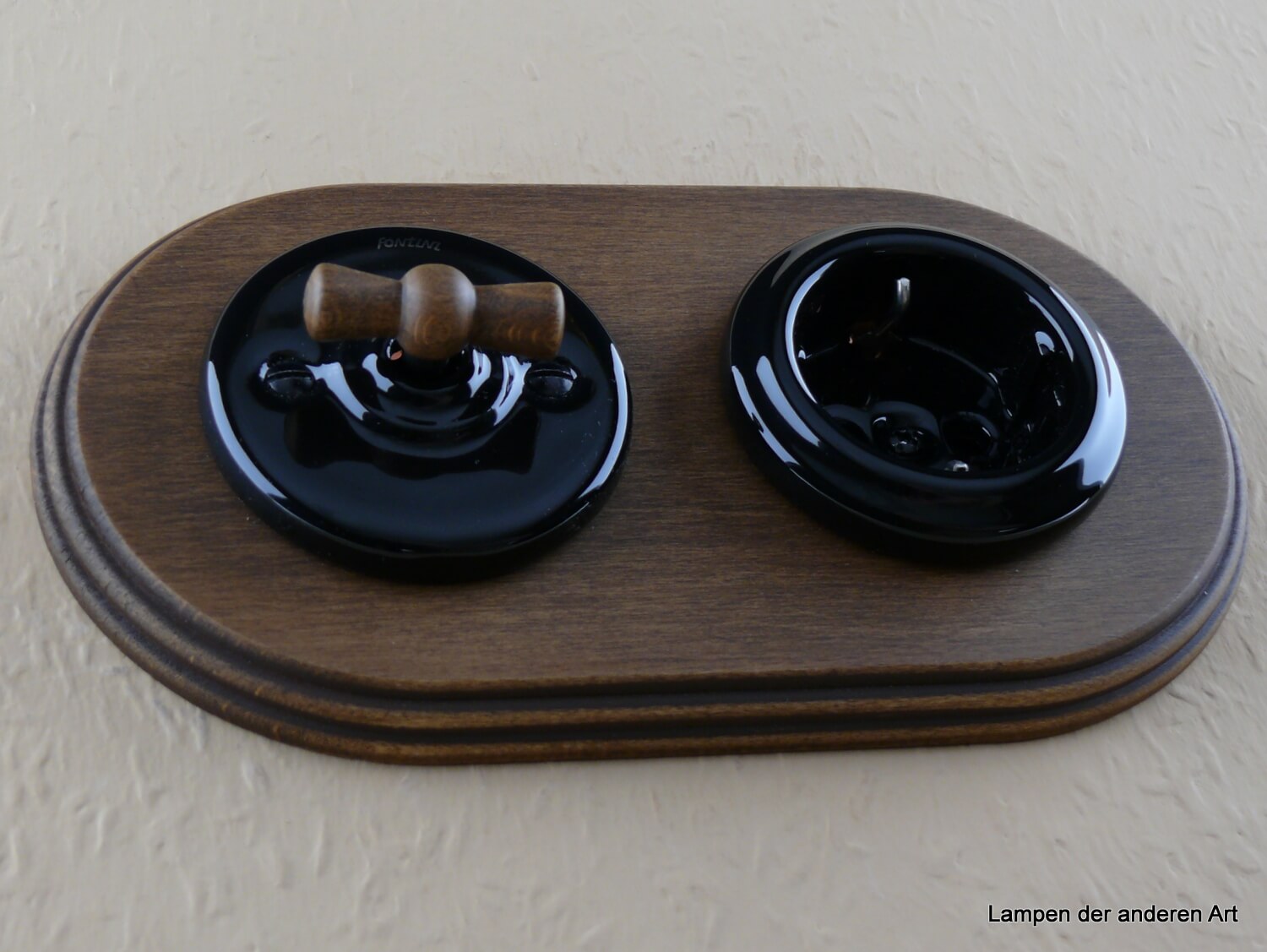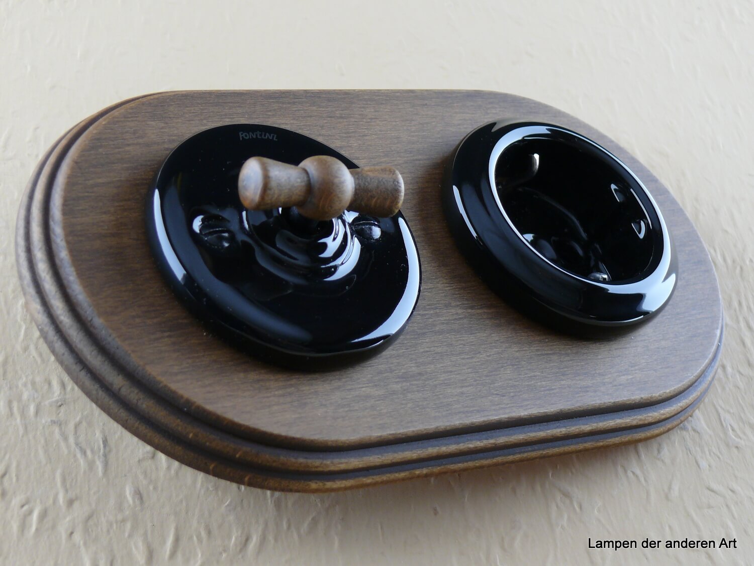 Garby Colonial Porzellan Retro Schalter-Steckdosenkombination von Fontini, bestehend aus Serien-Porzellandrehschalter schwarz mit einem Knebel aus gealtertem Buchenholz sowie einem