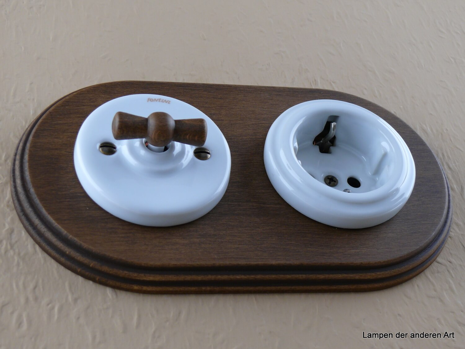 Garby Colonial Porzellan Retro Schalter-Steckdosenkombination von Fontini, bestehend aus Aus-Wechsel-Porzellandrehschalter weiß mit einem Knebel aus gealtertem Buchenholz sowie einem