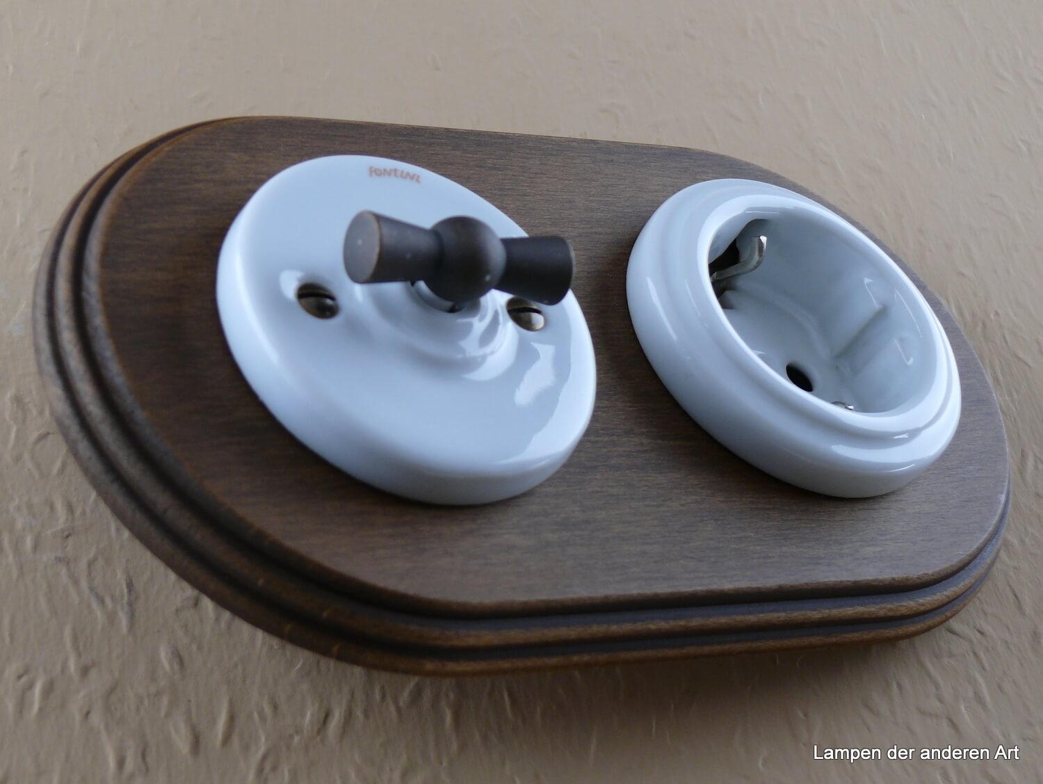 Diese Schalter-Steckdosen Variation aus edlem weißem Porzellan, eingebettet in einem ansprechenden 2fach Massivholzrahmen aus gealteter Buche, vereint zeitloses Design mit modernen Sicherheitsstandards. Als Schalter kommt ein Serien-Drehmechanismus zum Einsatz (wenn Sie mit einem Schalter zwei verschiedene Leuchten schalten wollen – bei herkömmlichen Schaltern Doppelwippe). Diese Geräteverbindung ist auch mit einem Aus-Wechseldrehschalter in unserem Shop verfügbar - in der Artikelnummer steht anstatt - SS dann - AW). Mit seinem Drehknebel aus Messing patiniert verleiht er der Kombination eine einzigartige Vintage-Note und sorgt für eine angenehme Bedienung. Der integrierte weiße Schuko-Steckdoseneinsatz ist mit einem effektiven Kinderschutz ausgestattet. Dunkel patinierte sichtbare Befestigungsschrauben ergänzen das Gesamtbild. Sowohl das Schaltwerk als auch die Steckdose sind VDE zertifiziert. Die Montage auf gängigen Unterputzdosen ist unkompliziert und ermöglicht eine problemlose Integration in bestehende und neue Elektroinstallationen. Die Installationsmaße finden Sie in den Bildern der Artikelbeschreibung.