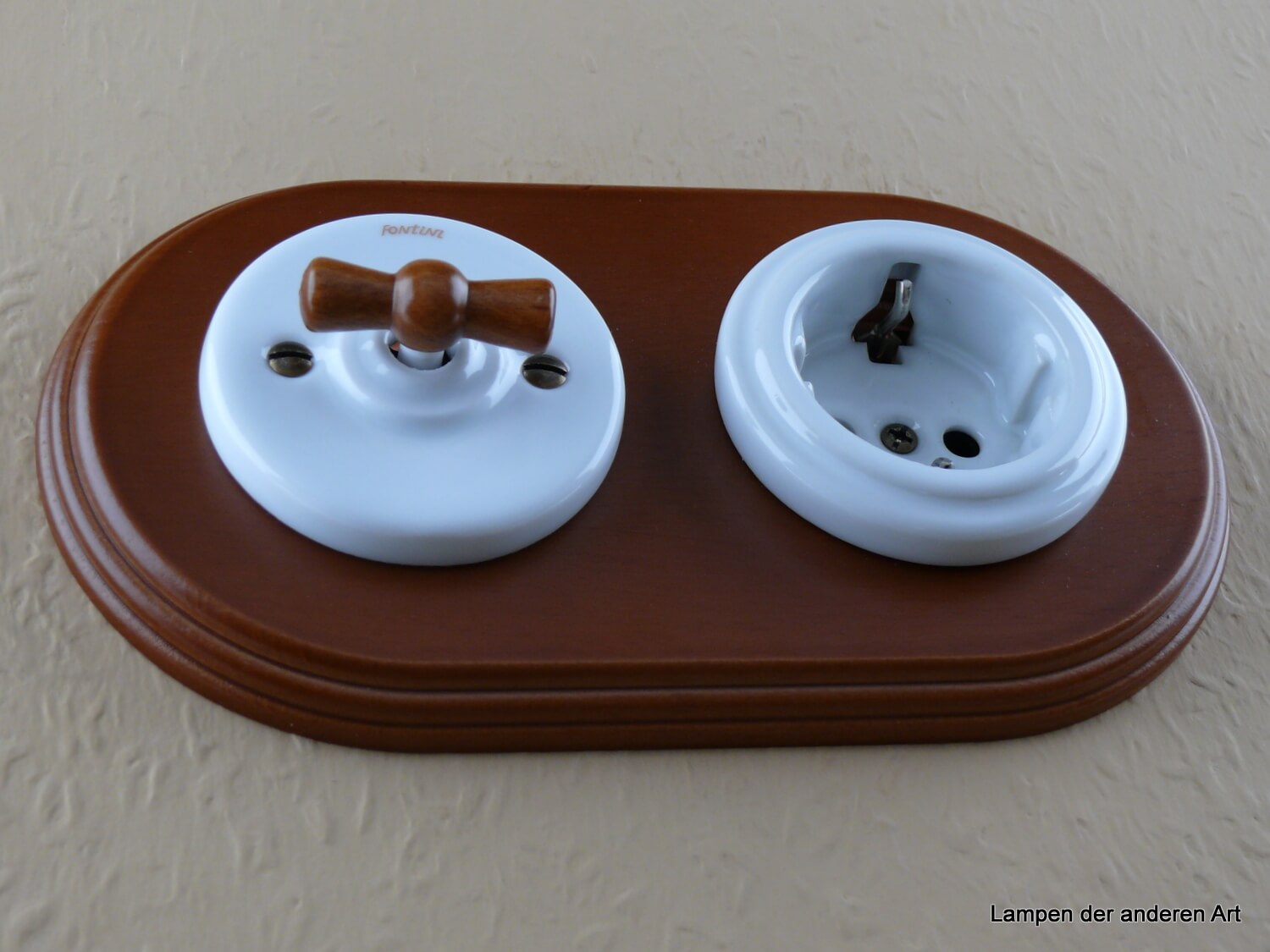 Garby Colonial Porzellan Retro Schalter-Steckdosenkombination von Fontini, bestehend aus Aus-Wechsel-Porzellandrehschalter weiß mit einem Holzknebel aus honigfarbener Buche sowie einem Steckdoseneinsatz ebenfalls aus weißem Porzellan, Montage horizontal oder vertikal möglich