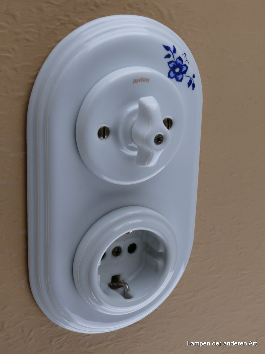 Garby Colonial Porzellan Retro Schalter-Steckdosenkombination von Fontini, bestehend aus Serien-Porzellandrehschalter weiß mit einem weißem Knebel aus Porzellan in Retroform sowie einem