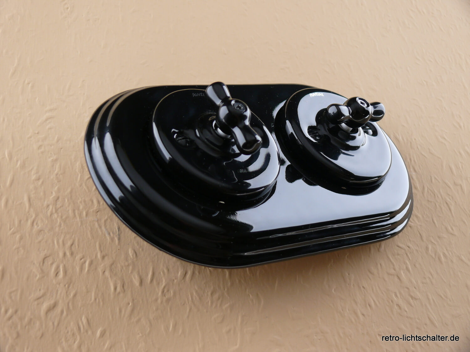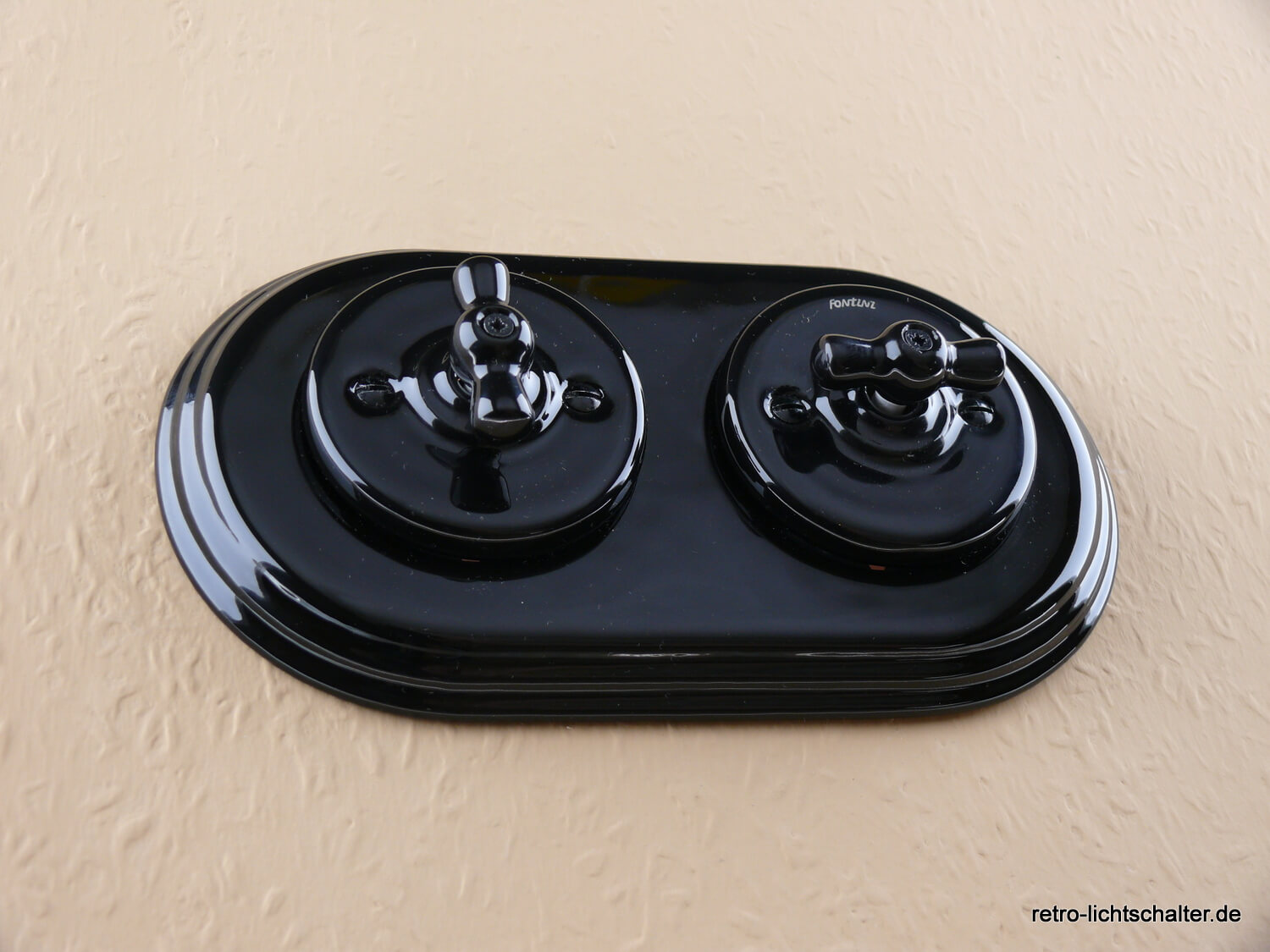 Garby Colonial Porzellan Retro Schalterkombination von Fontini, bestehend aus zwei Aus-Wechsel-Porzellandrehschaltern schwarz mit schwarzem Knebel aus Porzellan, Montage horizontal oder vertikal möglich