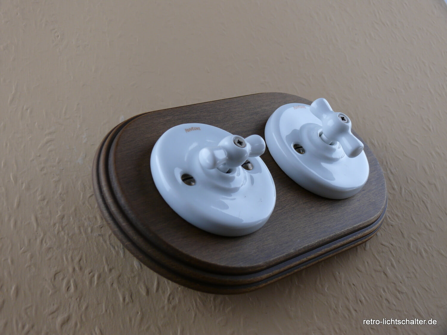 Garby Colonial Porzellan Retro Schalterkombination von Fontini, bestehend aus zwei Aus-Wechsel-Porzellandrehschaltern weiß mit weißem Knebel aus Porzellan, Montage horizontal oder vertikal möglich