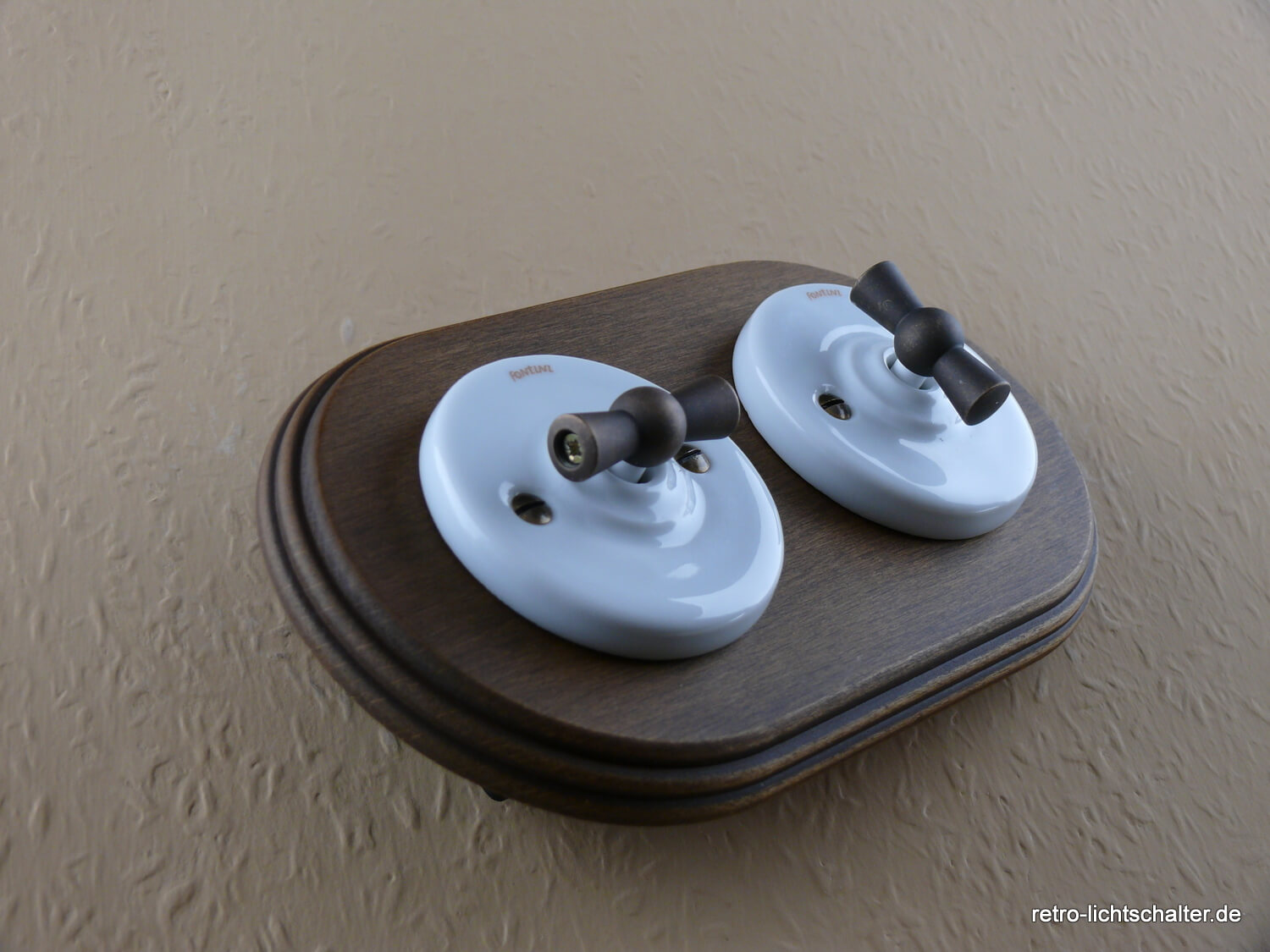 Diese Schalter-Variation aus edlem weißem Porzellan, eingebettet in einem ansprechenden 2fach Rahmen aus gealtertem und profiliertem Buchenholz, vereint zeitloses Design mit modernen Sicherheitsstandards. Als Schalter kommen zwei Aus-Wechsel Mechanismen zum Einsatz (für beide Schaltungsvarianten geeignet). Diese Geräteverbindung ist auch mit einem Serienschalter möglich (wenn Sie mit einem Schalter zwei verschiedene Leuchten schalten wollen – bei herkömmlichen Schaltern Doppelwippe). Bitte fragen Sie diese Kombination bei Bedarf an. Mit seinem Drehknebel aus patiniertem Messing verleiht er der Kombination eine einzigartige Vintage-Note und sorgt für eine angenehme Bedienung. Dunkel patinierte sichtbare Befestigungsschrauben ergänzen das Gesamtbild. Die Schaltwerke sind selbstverständlich VDE zertifiziert. Die Montage auf gängigen Unterputzdosen (nur Schraubbefestigung) ist unkompliziert und ermöglicht eine problemlose Integration in bestehende und neue Elektroinstallationen. Die Installationsmaße finden Sie in den Bildern der Artikelbeschreibung.