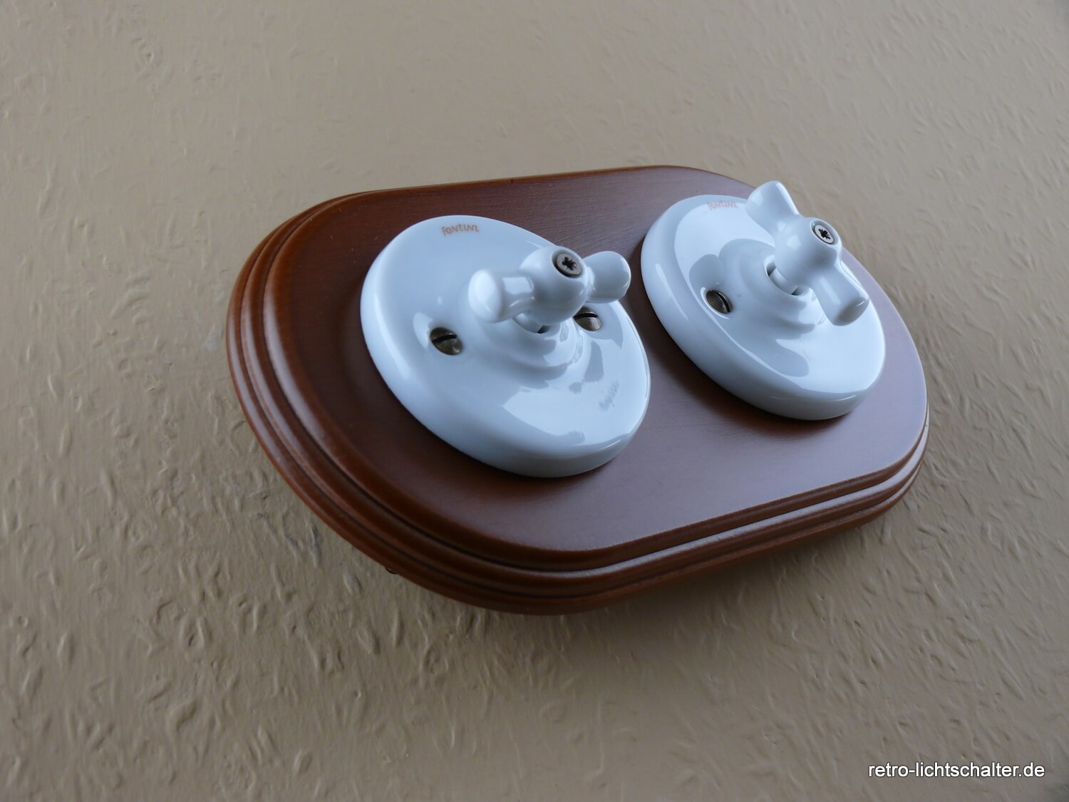 Diese Schalter-Variation aus edlem weißem Porzellan, eingebettet in einem ansprechenden 2fach Rahmen aus honigfarbenem und profiliertem Buchenholz, vereint zeitloses Design mit modernen Sicherheitsstandards. Als Schalter kommen zwei Aus-Wechsel Mechanismen zum Einsatz (für beide Schaltungsvarianten geeignet). Diese Geräteverbindung ist auch mit einem Serienschalter möglich (wenn Sie mit einem Schalter zwei verschiedene Leuchten schalten wollen – bei herkömmlichen Schaltern Doppelwippe). Bitte fragen Sie diese Kombination bei Bedarf an. Mit seinem Drehknebel aus weißem Porzellan verleiht er der Kombination eine einzigartige Vintage-Note und sorgt für eine angenehme Bedienung. Dunkel patinierte sichtbare Befestigungsschrauben ergänzen das Gesamtbild. Die Schaltwerke sind selbstverständlich VDE zertifiziert. Die Montage auf gängigen Unterputzdosen (nur Schraubbefestigung) ist unkompliziert und ermöglicht eine problemlose Integration in bestehende und neue Elektroinstallationen. Die Installationsmaße finden Sie in den Bildern der Artikelbeschreibung.