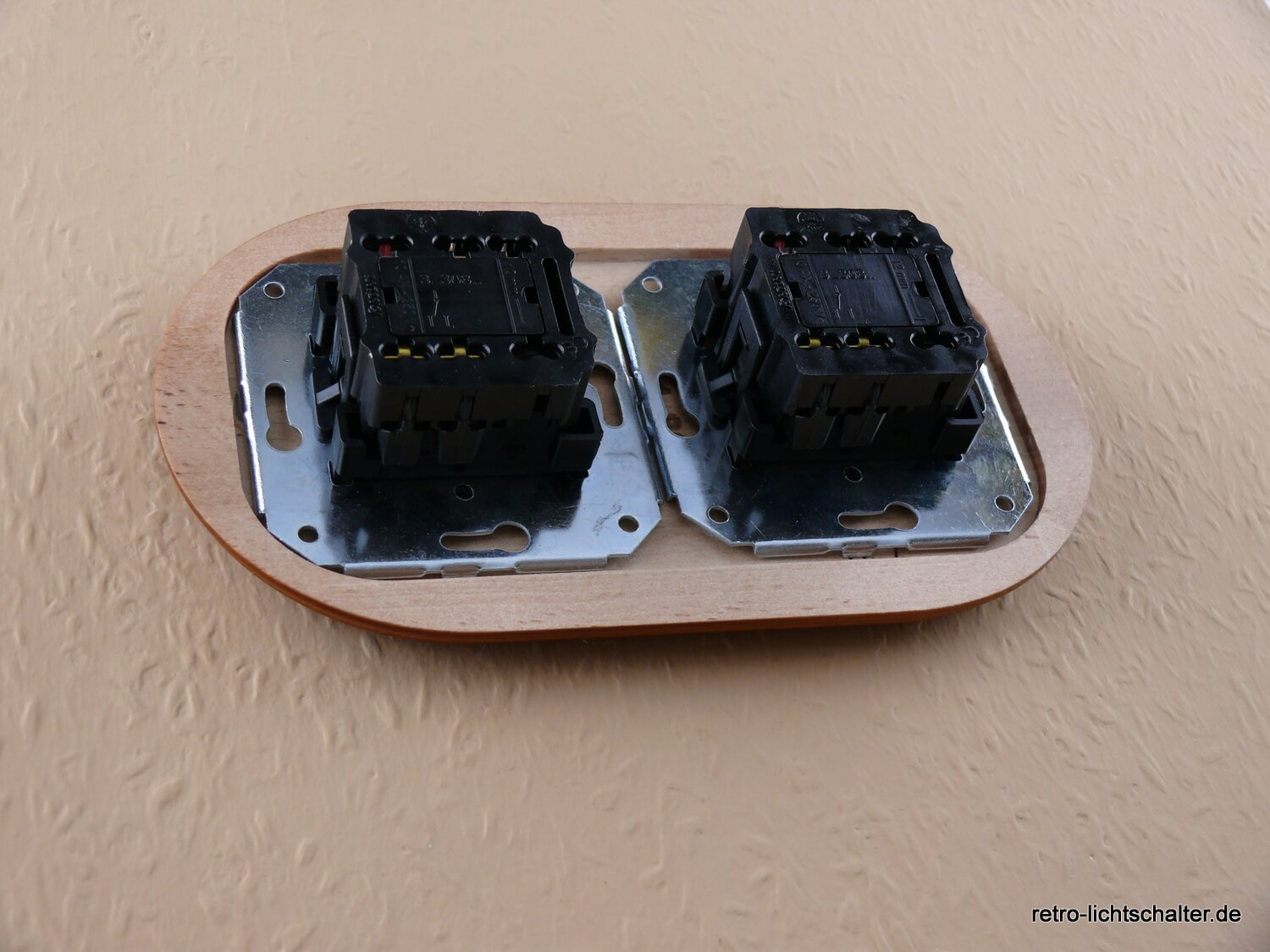 Diese Schalter-Variation aus edlem weißem Porzellan, eingebettet in einem ansprechenden 2fach Rahmen aus honigfarbenem und profiliertem Buchenholz, vereint zeitloses Design mit modernen Sicherheitsstandards. Als Schalter kommen zwei Aus-Wechsel Mechanismen zum Einsatz (für beide Schaltungsvarianten geeignet). Diese Geräteverbindung ist auch mit einem Serienschalter möglich (wenn Sie mit einem Schalter zwei verschiedene Leuchten schalten wollen – bei herkömmlichen Schaltern Doppelwippe). Bitte fragen Sie diese Kombination bei Bedarf an. Mit seinem Drehknebel aus patiniertem Messing verleiht er der Kombination eine einzigartige Vintage-Note und sorgt für eine angenehme Bedienung. Dunkel patinierte sichtbare Befestigungsschrauben ergänzen das Gesamtbild. Die Schaltwerke sind selbstverständlich VDE zertifiziert. Die Montage auf gängigen Unterputzdosen (nur Schraubbefestigung) ist unkompliziert und ermöglicht eine problemlose Integration in bestehende und neue Elektroinstallationen. Die Installationsmaße finden Sie in den Bildern der Artikelbeschreibung.