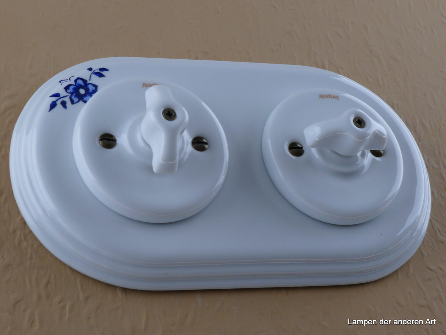 Diese Schalter-Variation aus edlem weißem Porzellan, eingebettet in einem ansprechenden weißen 2fach Rahmen aus profiliertem Porzellan mit dezentem blauem Blütendekor, vereint zeitloses Design mit modernen Sicherheitsstandards. Als Schalter kommen zwei Aus-Wechsel Mechanismen zum Einsatz (für beide Schaltungsvarianten geeignet). Diese Geräteverbindung ist auch mit einem Serienschalter möglich (wenn Sie mit einem Schalter zwei verschiedene Leuchten schalten wollen – bei herkömmlichen Schaltern Doppelwippe). Bitte fragen Sie diese Kombination bei Bedarf an. Mit seinem Drehknebel aus weißem Porzellan verleiht er der Kombination eine einzigartige Vintage-Note und sorgt für eine angenehme Bedienung. Dunkel patinierte sichtbare Befestigungsschrauben ergänzen das Gesamtbild. Die Schaltwerke sind selbstverständlich VDE zertifiziert. Die Montage auf gängigen Unterputzdosen (nur Schraubbefestigung) ist unkompliziert und ermöglicht eine problemlose Integration in bestehende und neue Elektroinstallationen. Die Installationsmaße finden Sie in den Bildern der Artikelbeschreibung.