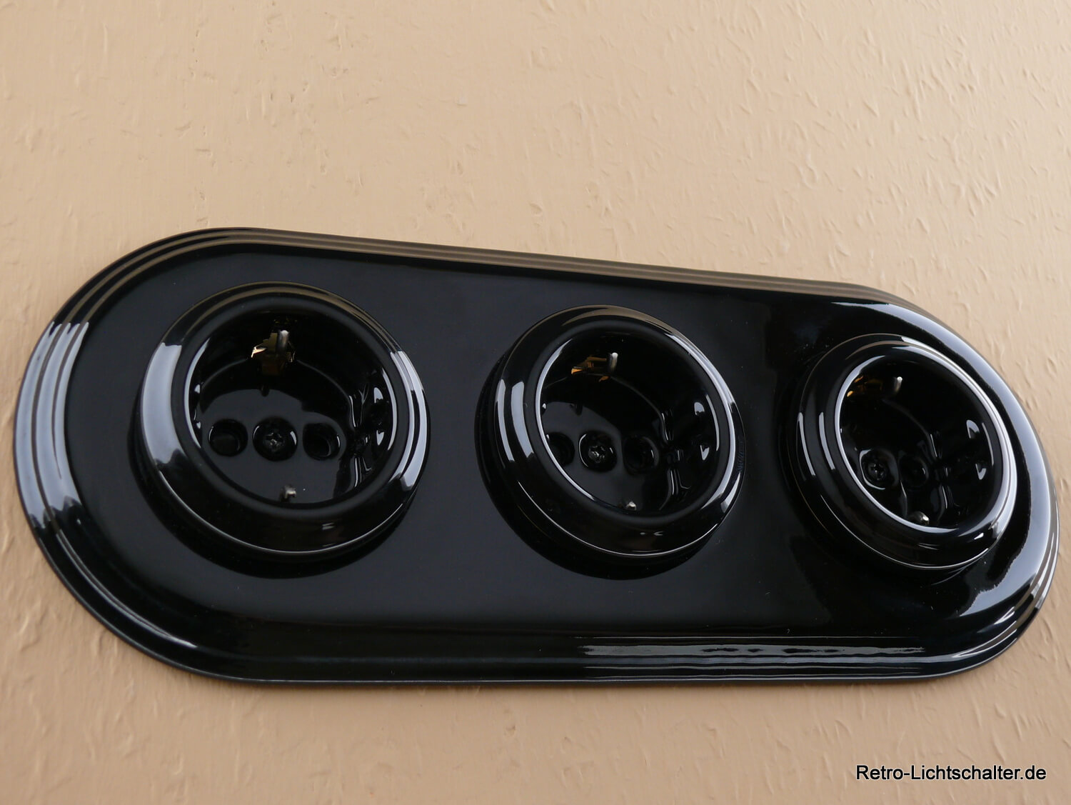 Retro Porzellan 3fach Steckdosenkombination schwarz HEGC302-SD-SD-SD.s