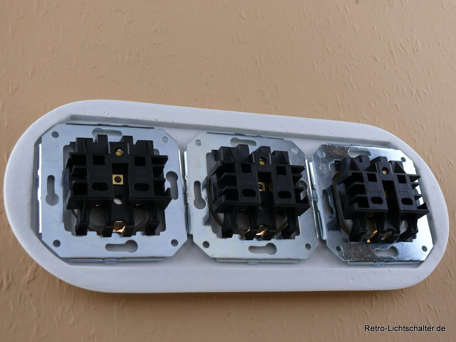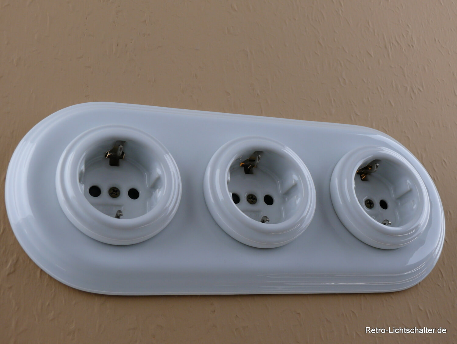 Die drei aus weißem Porzellan gefertigten Schukosteckdoseneinsätze werden von einem ebenfalls aus weißem Porzellan hergestellten Dreifachrahmen zentriert. Die Montage ist horizontal oder vertikal möglich. Durch den Steckklemmenanschluss ist eine einfache und sichere Installation gewährleistet. Zudem ist die Steckdose mit einem integrierten Kinderschutz ausgestattet und besitzt eine VDE Zertifizierung. Sie passt problemlos in alle gängigen Unterputzdosen mit Schraubbefestigung und vereint Funktionalität mit einem ansprechenden Retro-Look. Natürlich können Sie diese auch in anderen Kombinationen z.B als 1fach Steckdose, 2fach Steckdose oder in Kombination mit den klassischen Porzellandrehschaltern über unseren Shop beziehen.