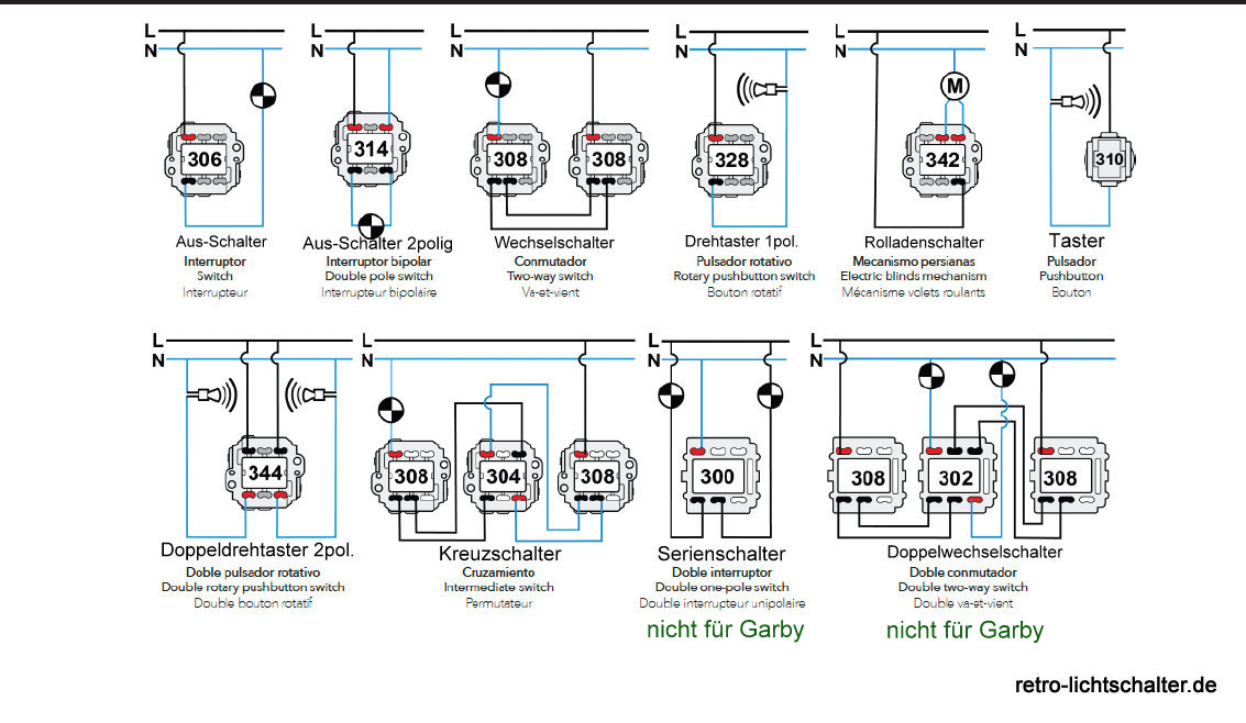 Unser Garby Schalter ermöglicht es Ihnen, den Schaltmechanismus an Ihre vorhandene Elektroinstallation anzupassen. Neben dem angebotenen Aus-Wechselschalter (für beide Schaltungsvarianten geeignet) sind auch andere Schaltmechanismen im Sortiment, z. B. Kreuzschalter, Rolladenschalter, zweipoliger Ausschalter sowie verschiedene Dreh- bzw. Drucktaster. Ebenso sind eine Vielzahl von Kommunikationssteckdosen lieferbar. Bitte sprechen Sie uns diesbezüglich gerne an. Wir sind eine eingetragene Elektroinstallationsfirma und kennen uns mit den Produkten bestens aus, da wie diese auch bei unseren Kunden installieren. Mit anderen Worten: Wir wissen was wir verkaufen.
